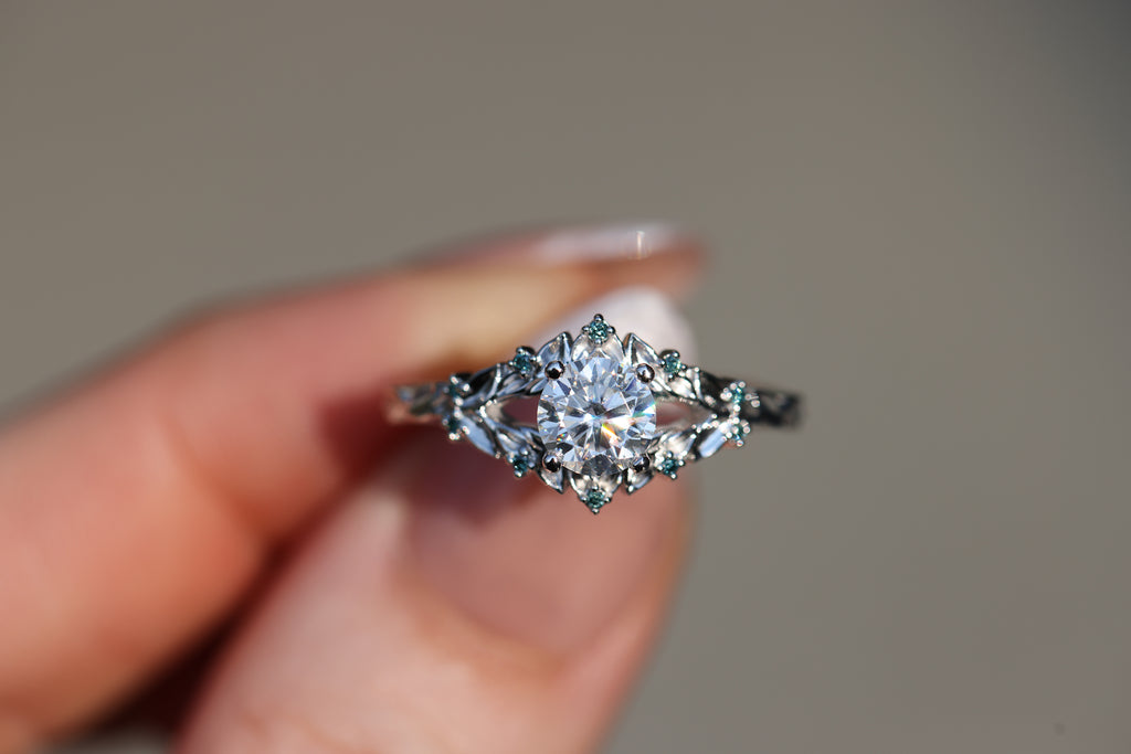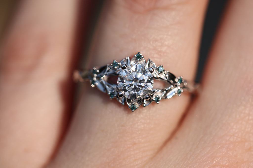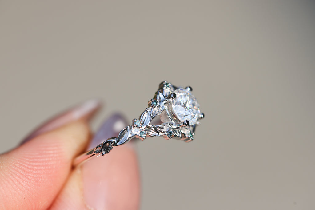 Briar Rose Solitaire with 6mm Round Moissanite and Teal Blue Diamonds