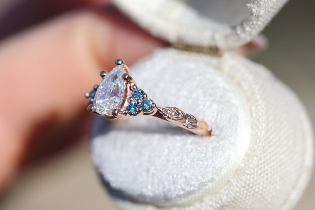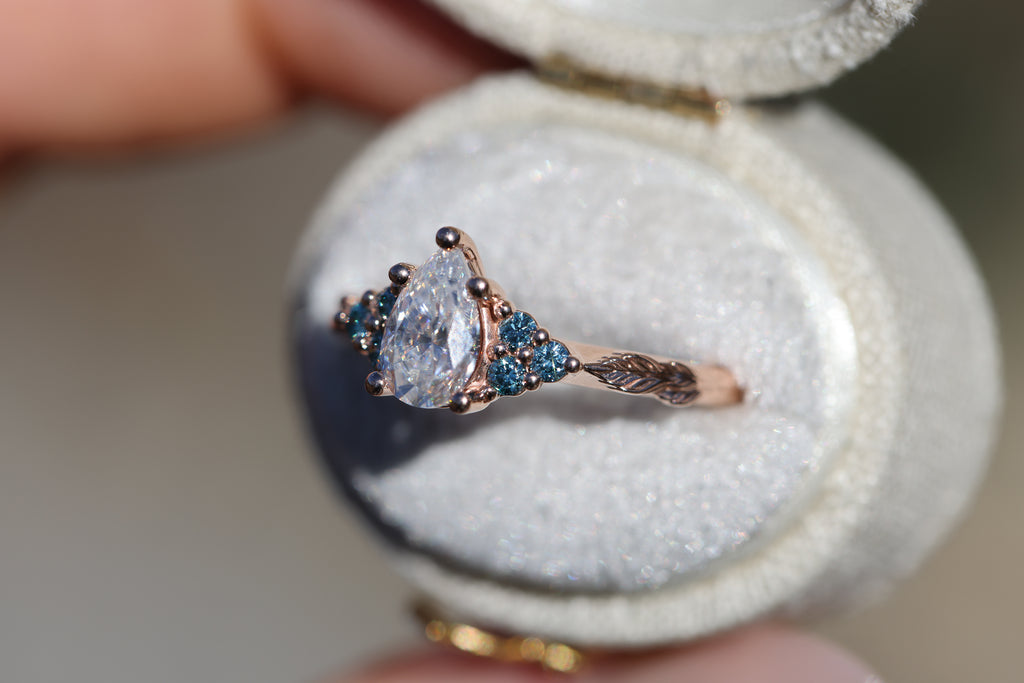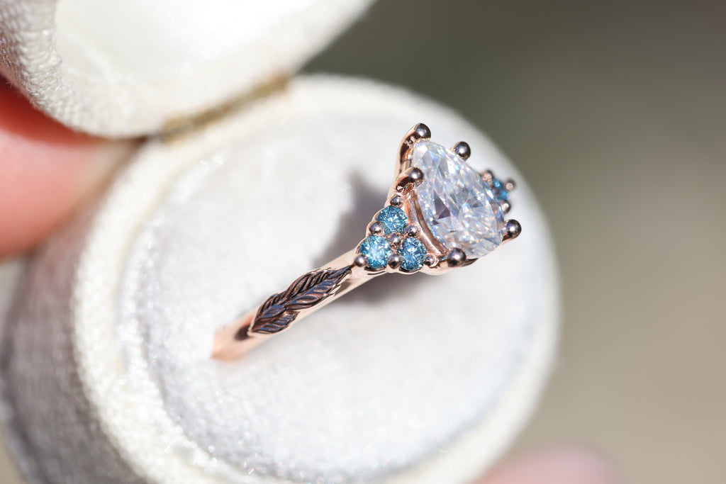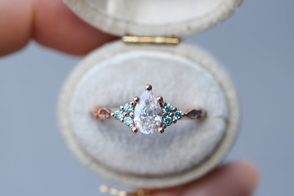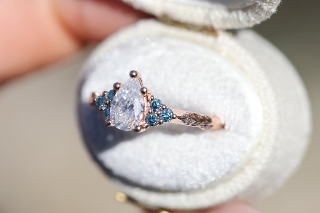 Seraphina with pear moissanite center and aqua irradiated diamonds