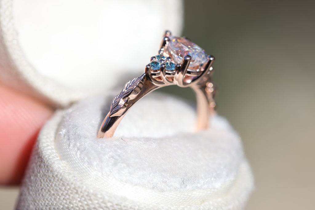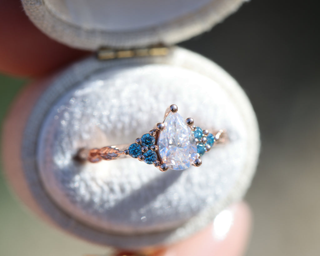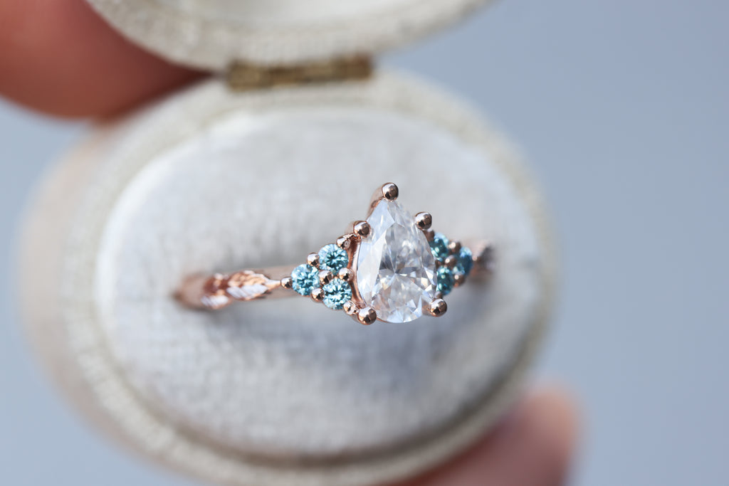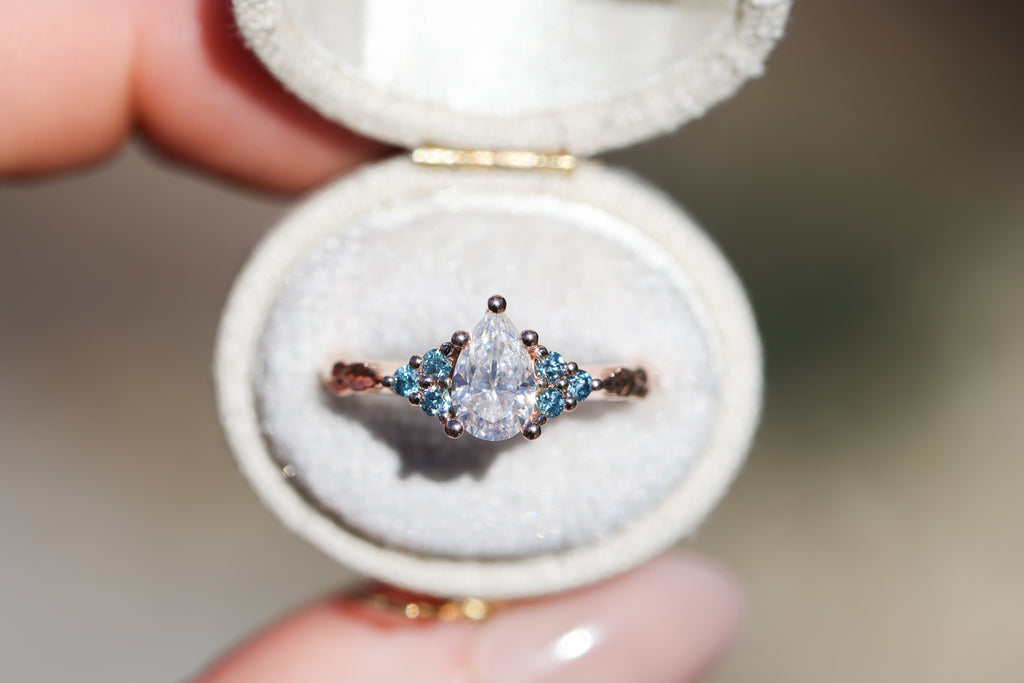 Seraphina with pear moissanite center and aqua irradiated diamonds