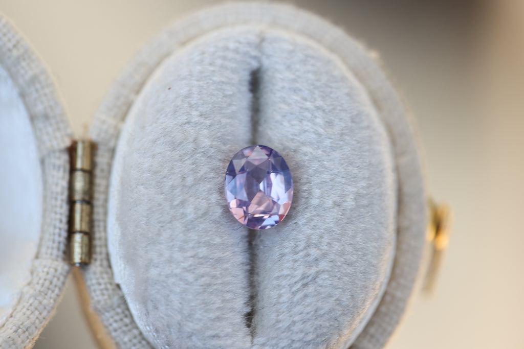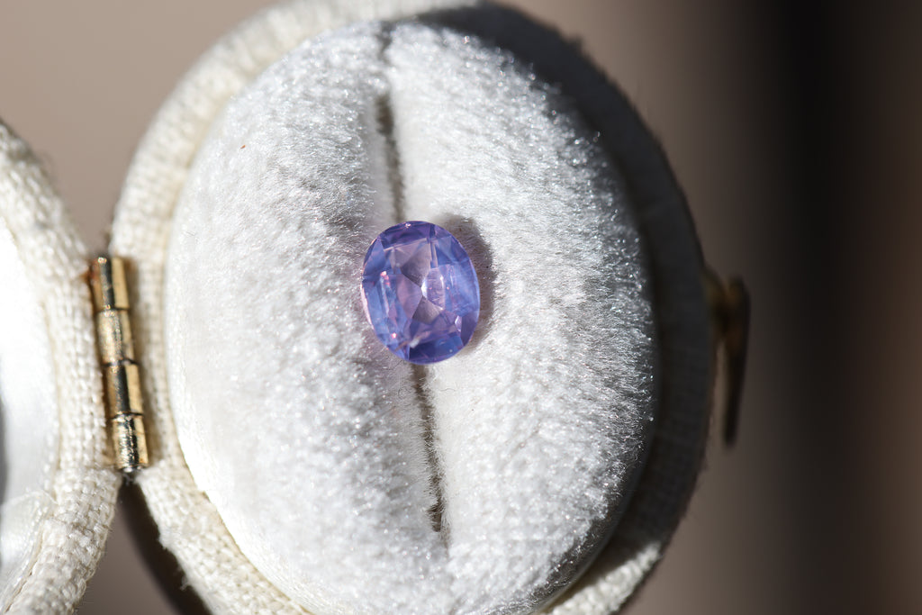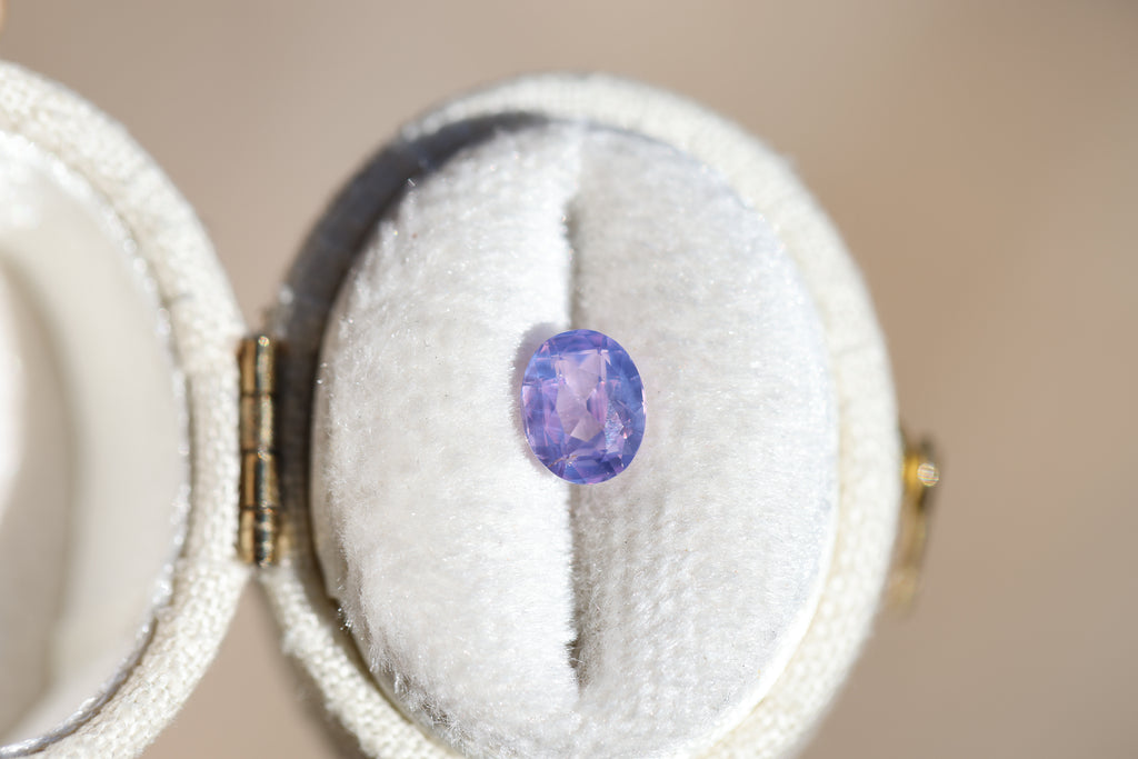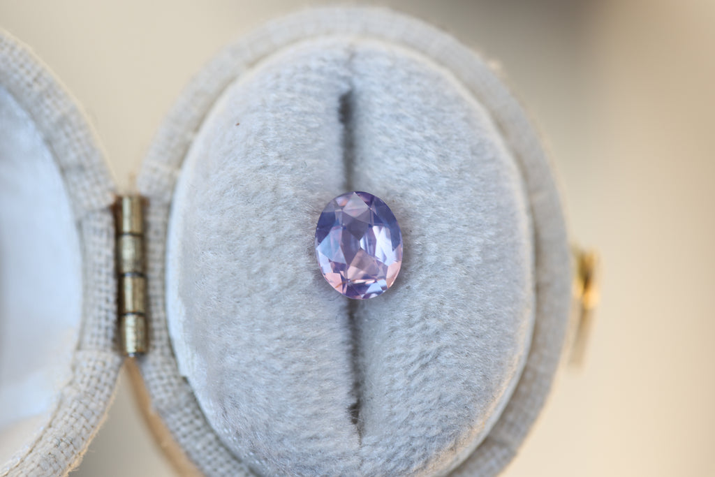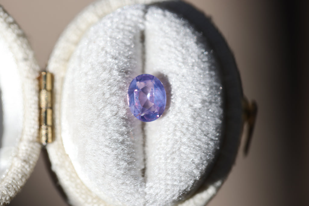 This absolute beauty is a magical opalescent sapphire with the prettiest lavender that pulls pink in certain lighting!