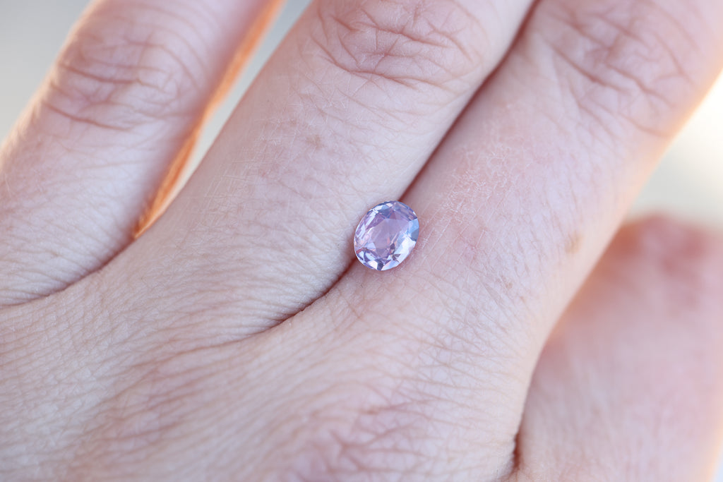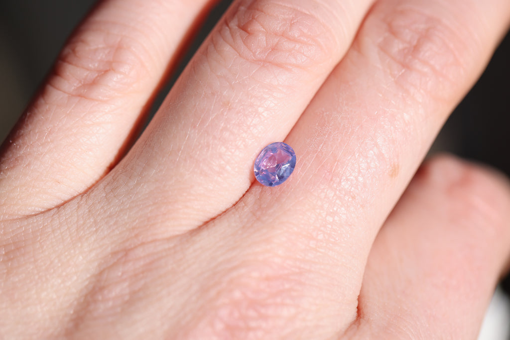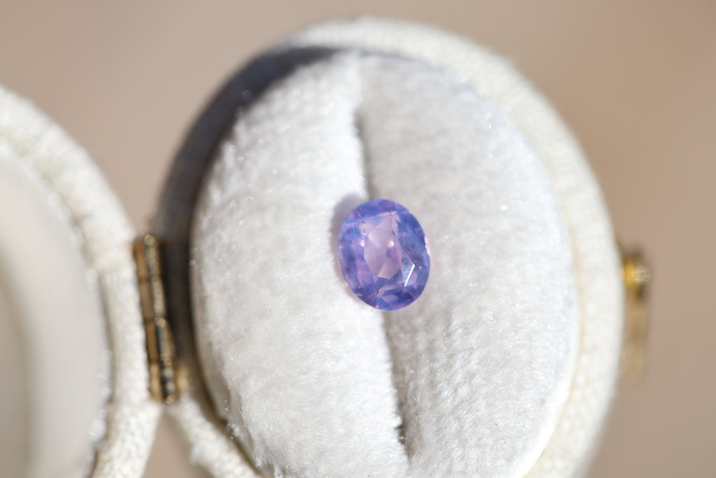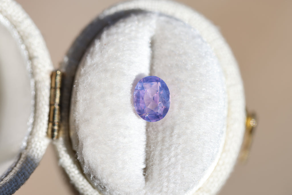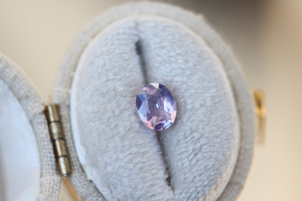 This absolute beauty is a magical opalescent sapphire with the prettiest lavender that pulls pink in certain lighting!