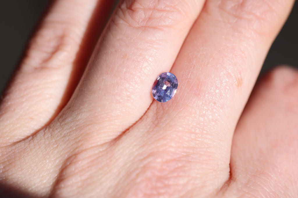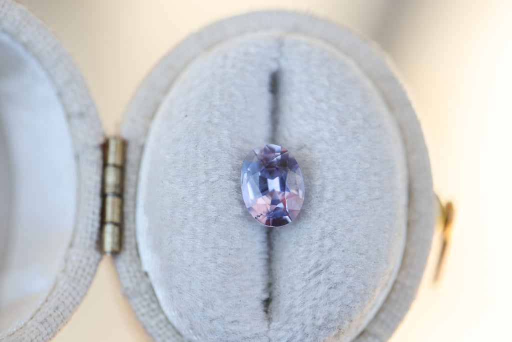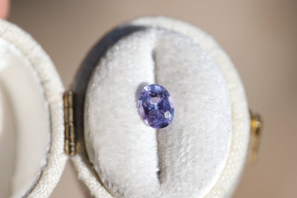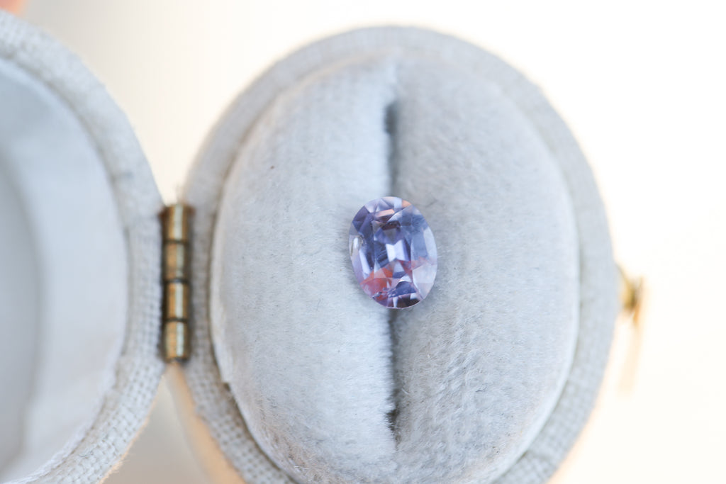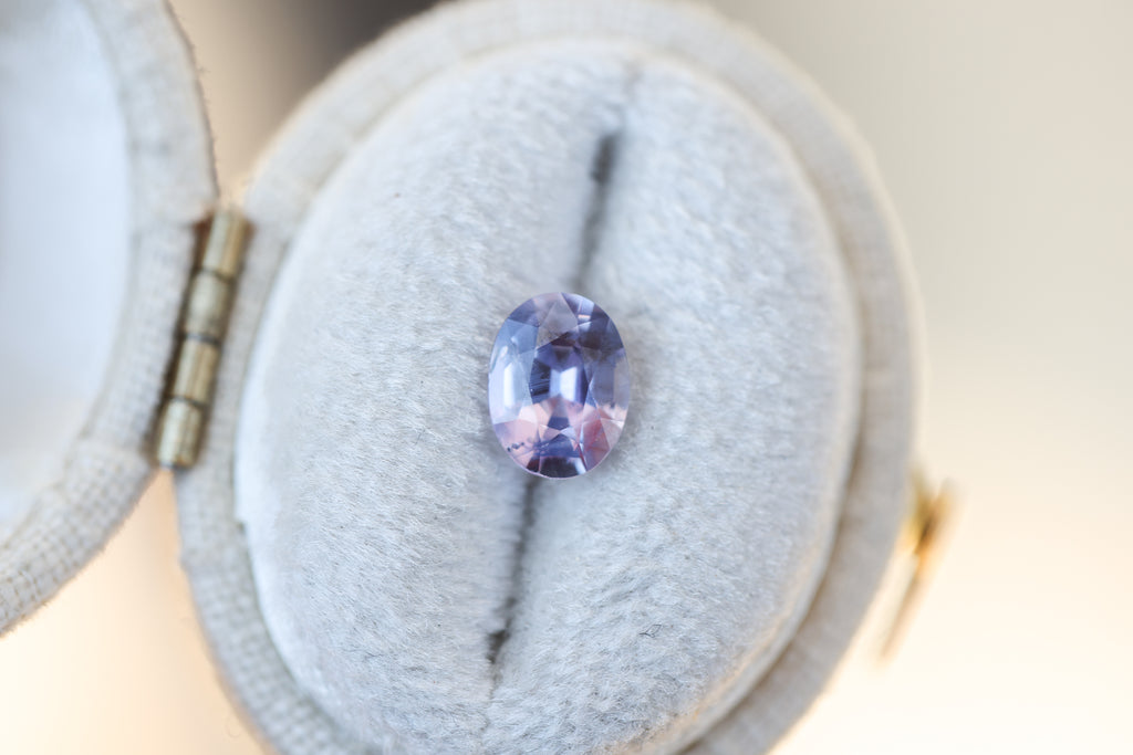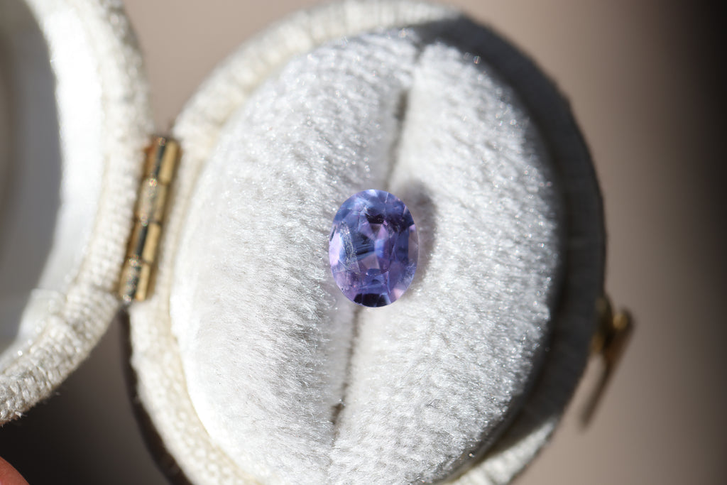 This absolute beauty is an oval lavender sapphire with the prettiest opalescence!