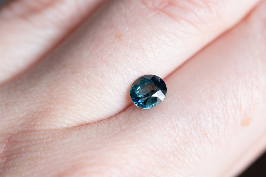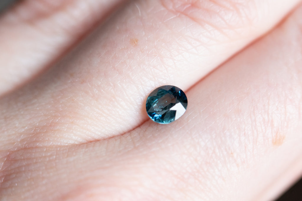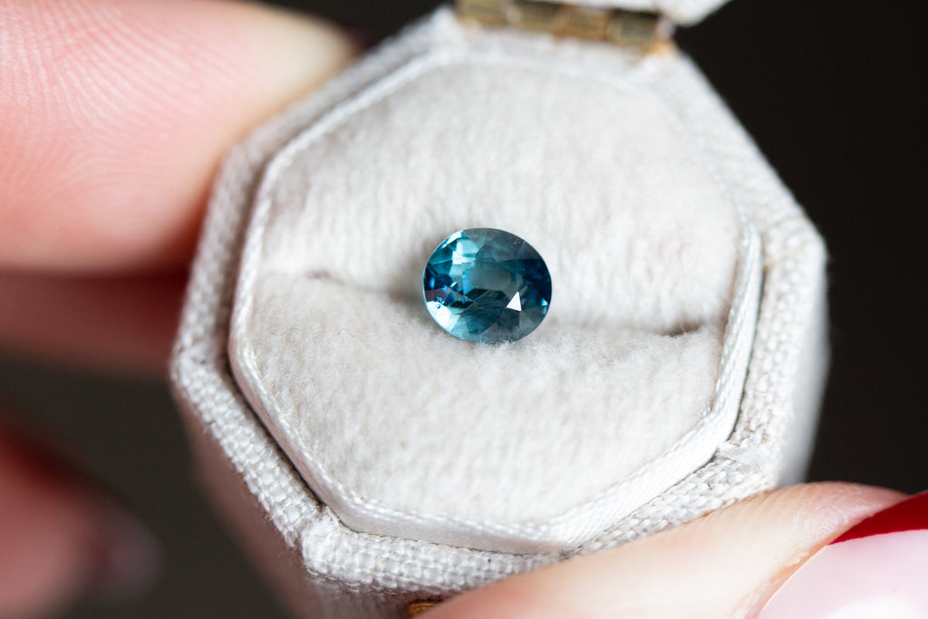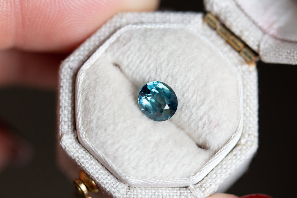 This gorgeous sapphire is a light to medium teal blue that pulls more of the teal color or blue color depending on how the light hits it. Very pretty stone!