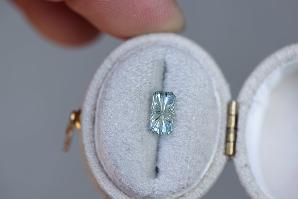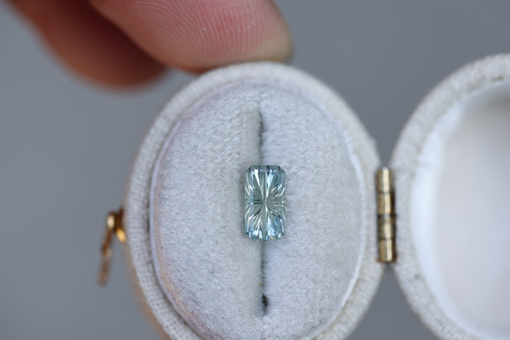This incredible rectangle light parti sapphire is the prettiest light blue with a light pop of sunshine in the center! It has award winning gem cutter John Dyer's custom Starbrite faceting that makes for an even more special one of a kind gem!