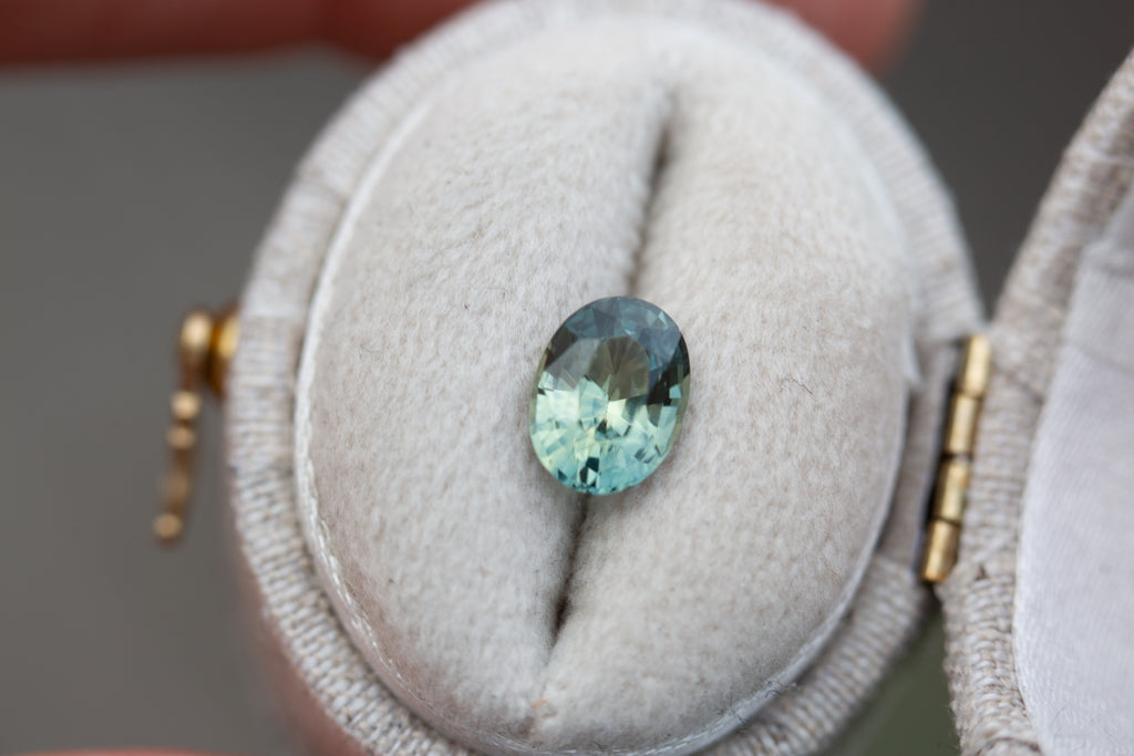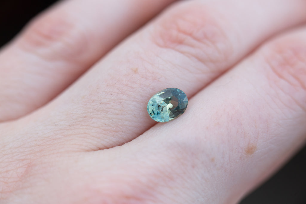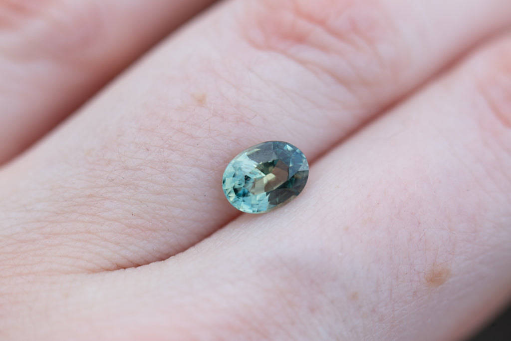 This oval teal sapphire is a beautiful mix of a mostly teal appearance with pops of light green that come to the forefront in certain lighting