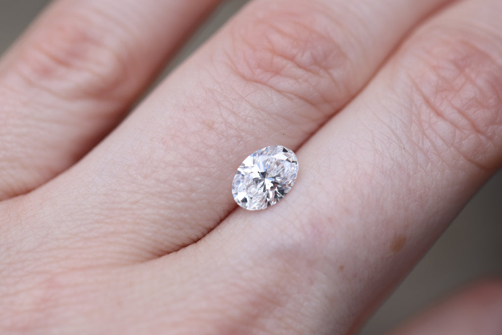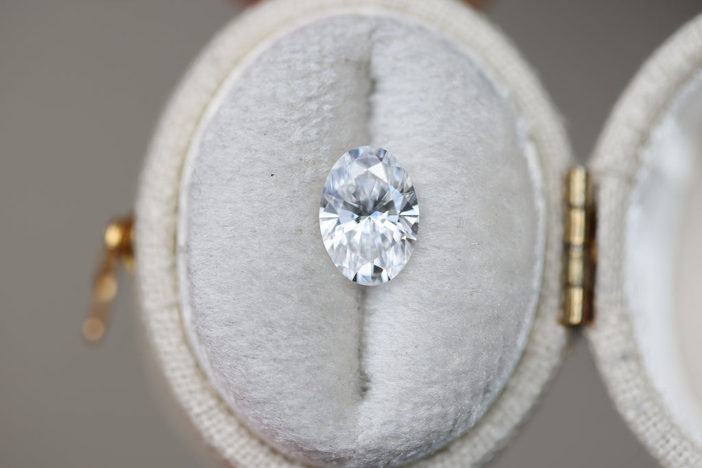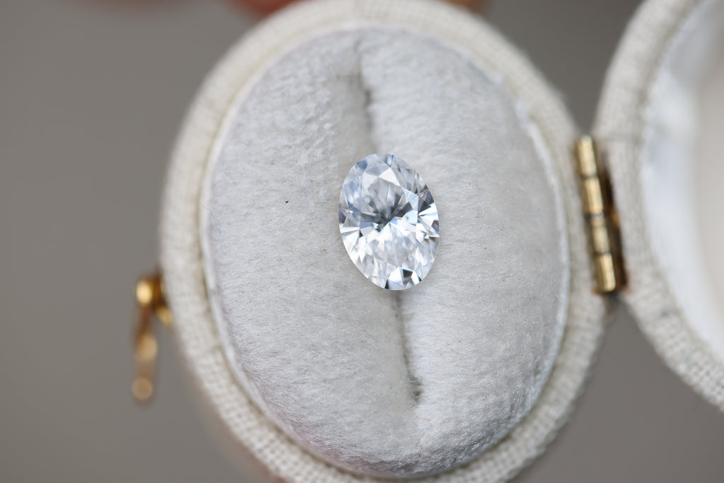 This absolute beauty is an oval lab diamond with bright D color and incredible sparkle!