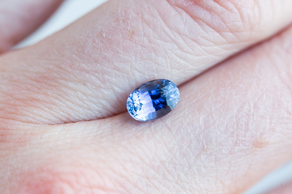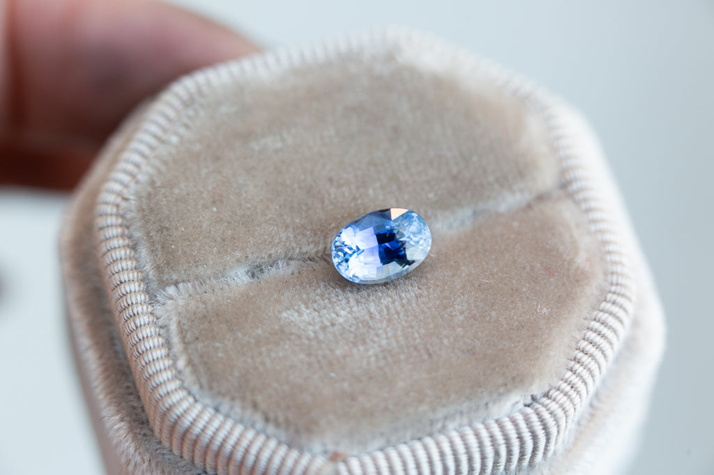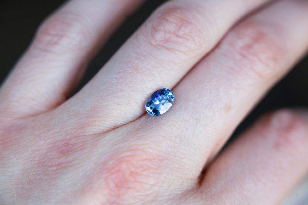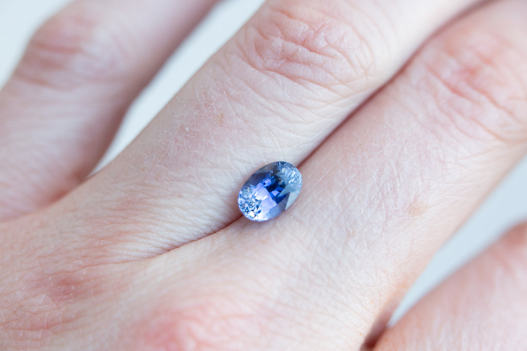 -This stone is a medium blue with some lighter blue zones and a darker periwinkle center. Does not appear as purple in person as it does in the pictures.