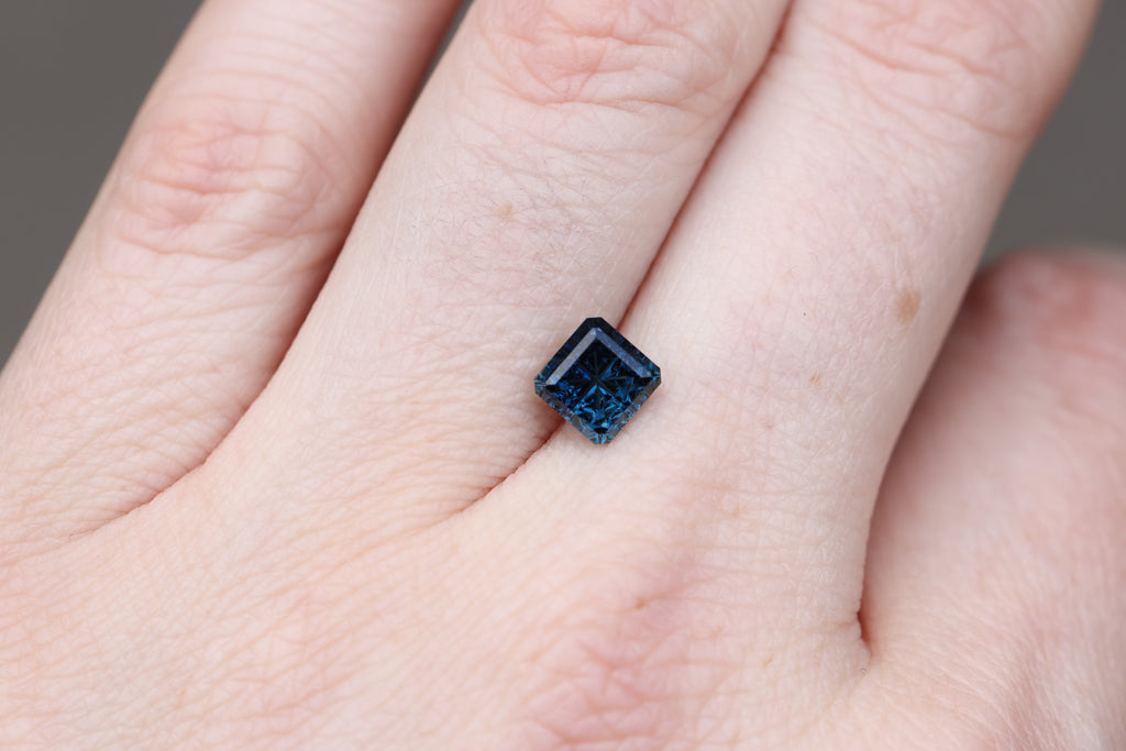 1.69ct square dark blue teal sapphire, Starbrite cut by John Dyer