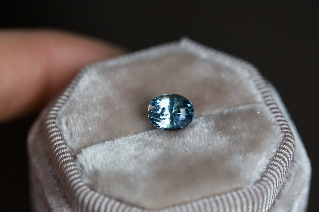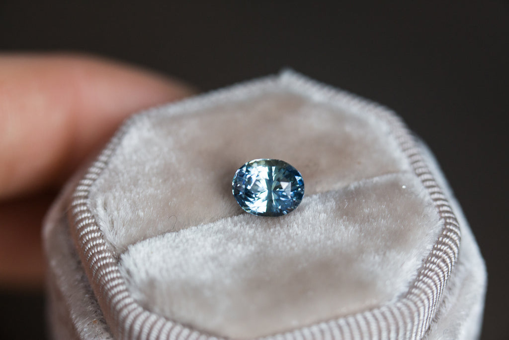 -Ceylon origin, heated. This stone is a lovely medium blue with a slice of light blue/teal throughout the middle. Extremely unique and one of a kind.