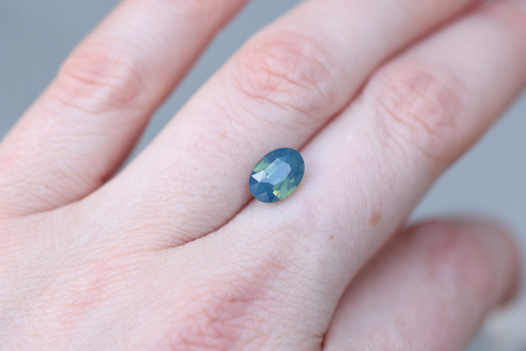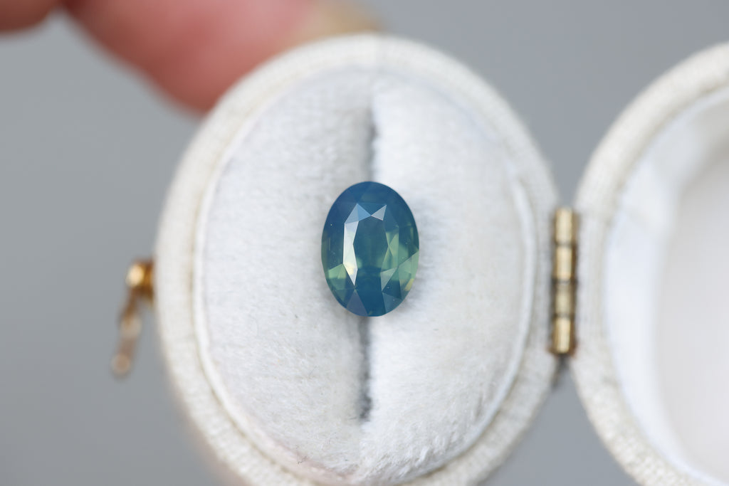 This incredible oval sapphire is a blue teal color that paired with it's magical opalescence gives the stone such an aqua goddess vibe!