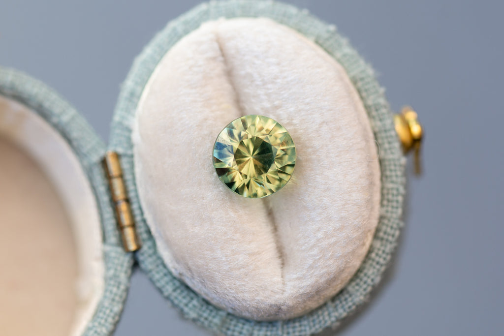 This one-of-a-kind sapphire is the most vibrant yellow green color with a hint of orange! Just mesmerizing!