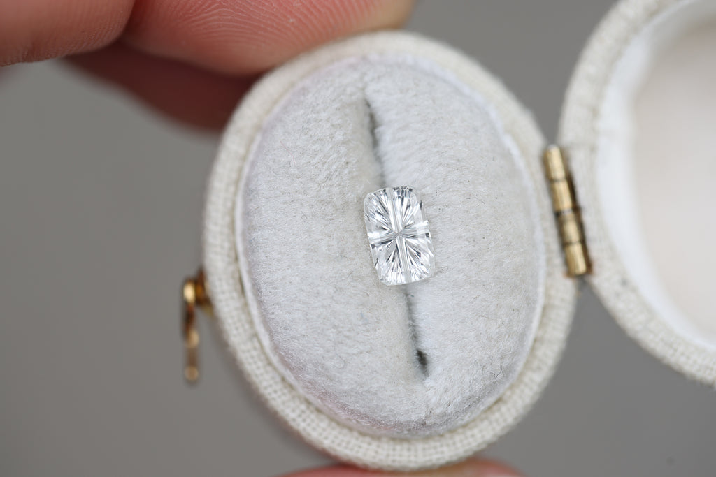 Such a gorgeous rectangle white sapphire with the incredible custom Starbrite faceting from award winning gem cutter John Dyer! It is just a beauty!