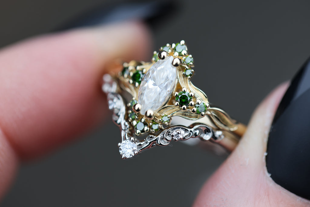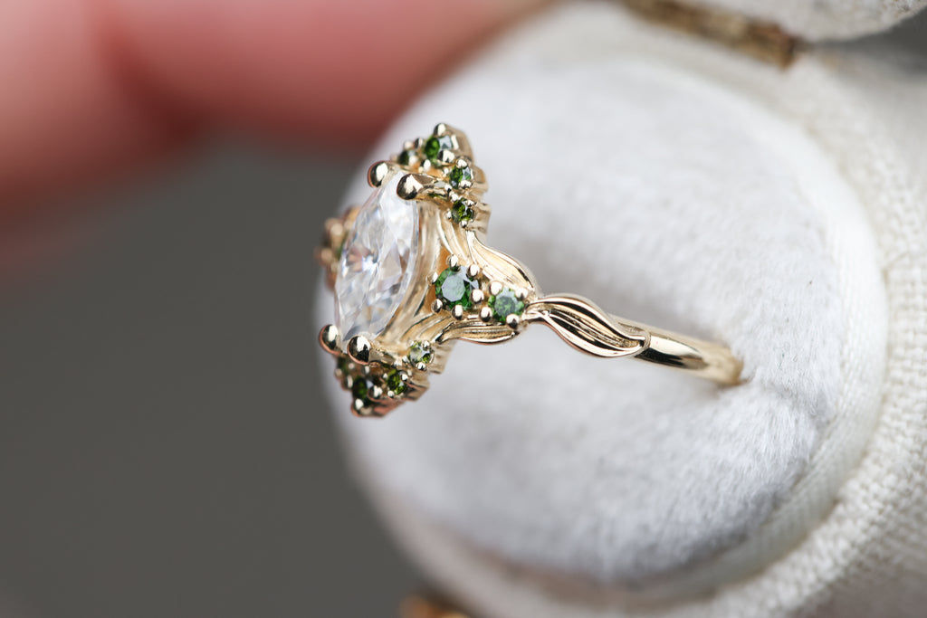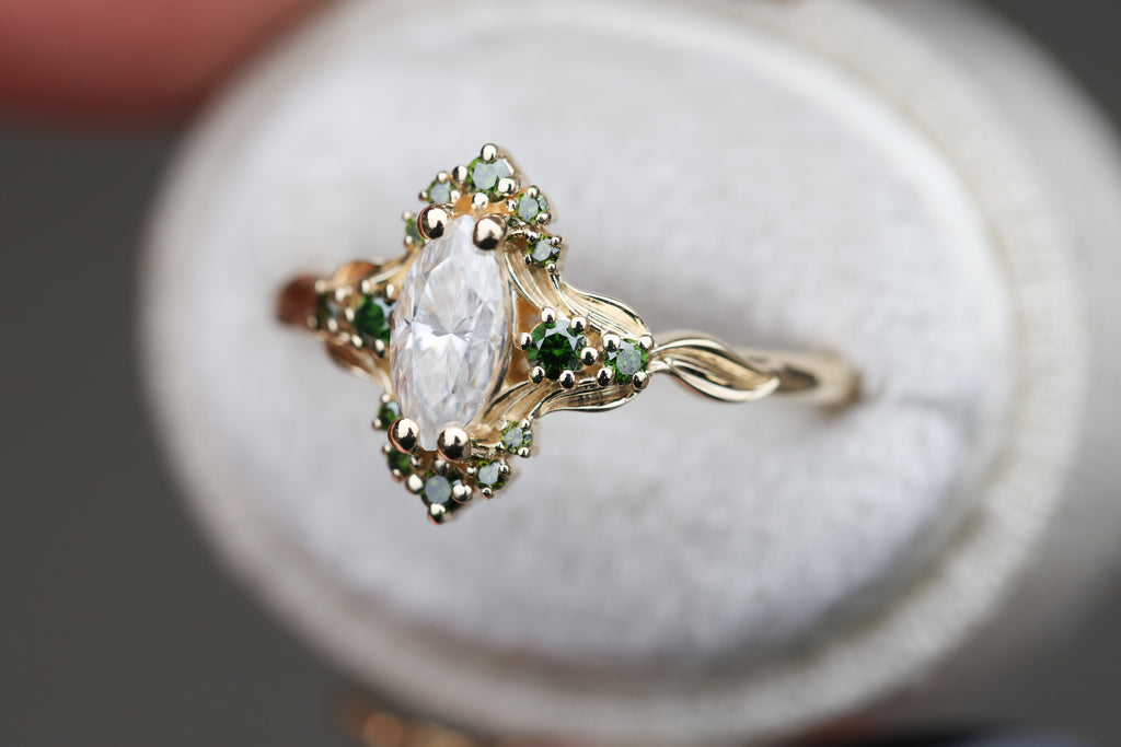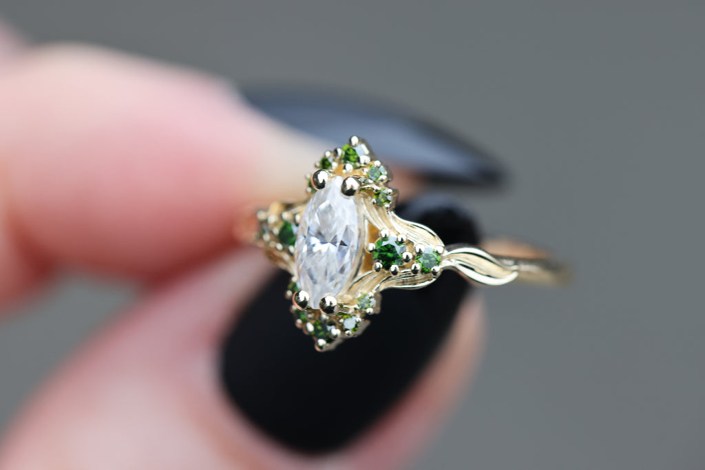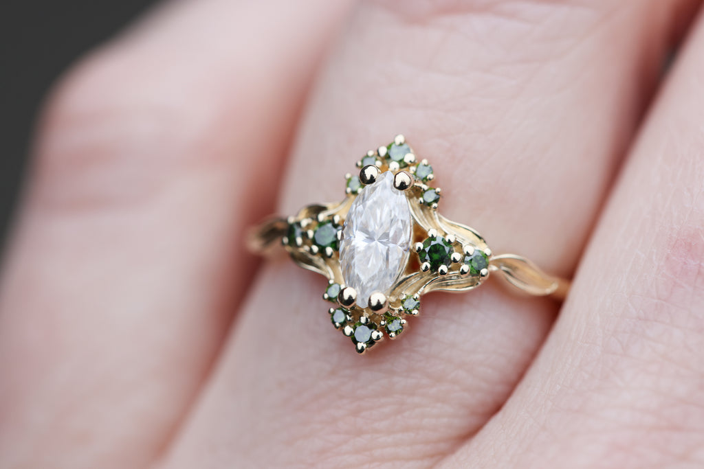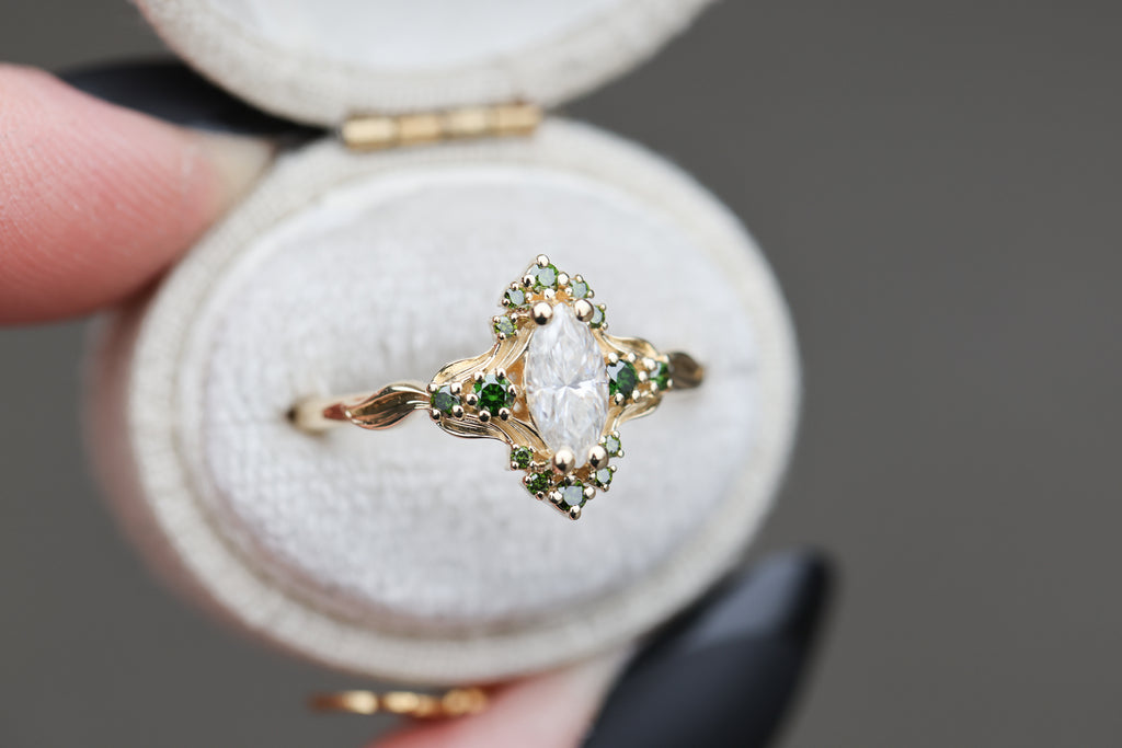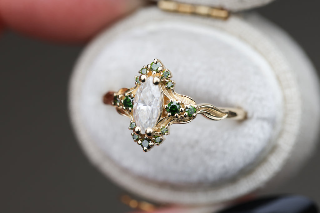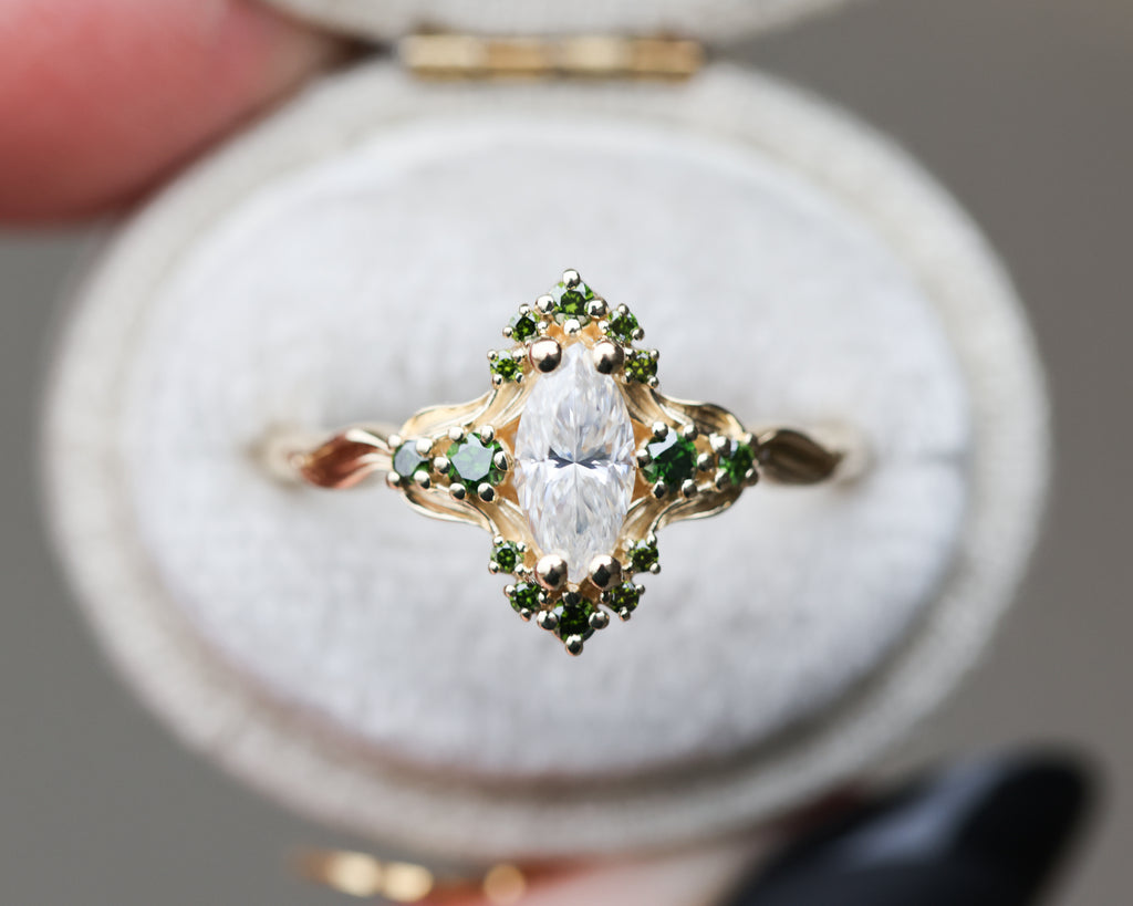 Astraea half halo with marquise moissanite and dark green irradiated diamonds
