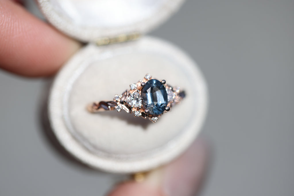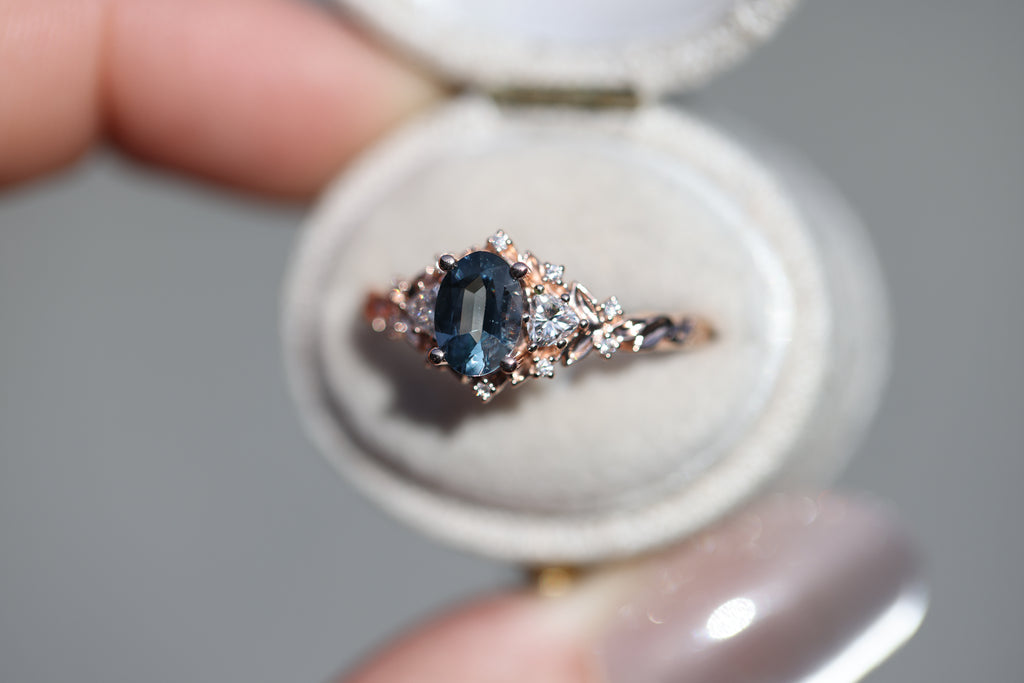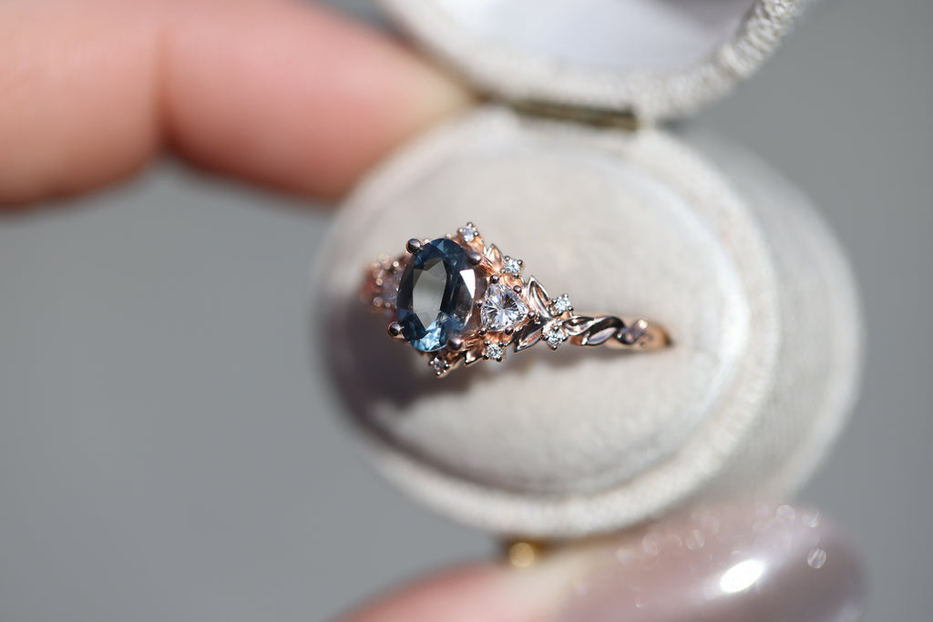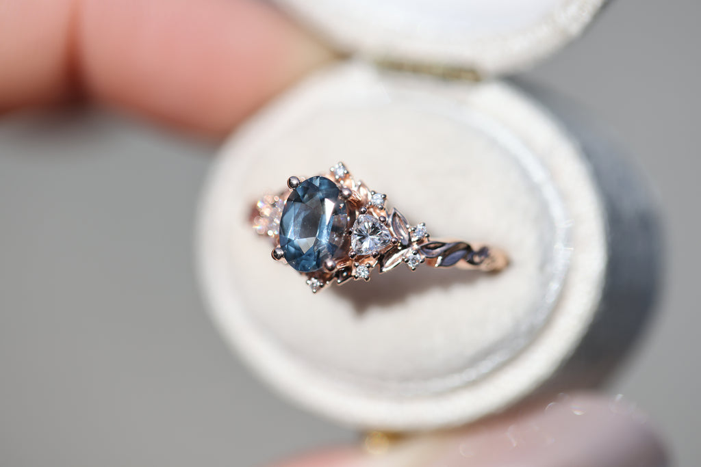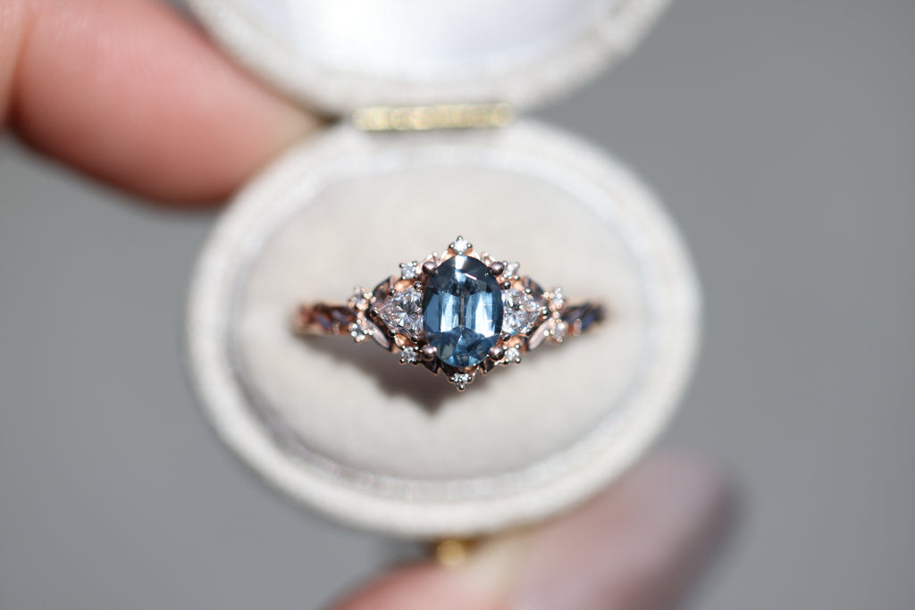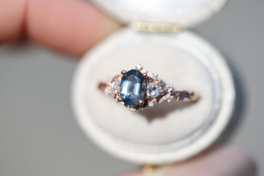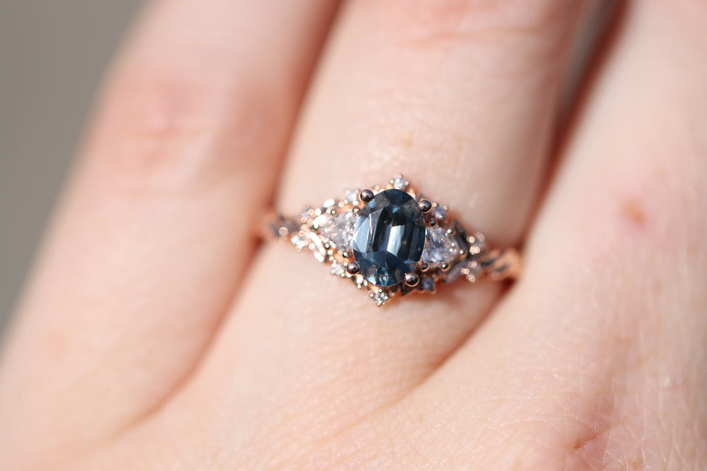 Briar Rose Three Stone with 7x5mm oval grey spinel center