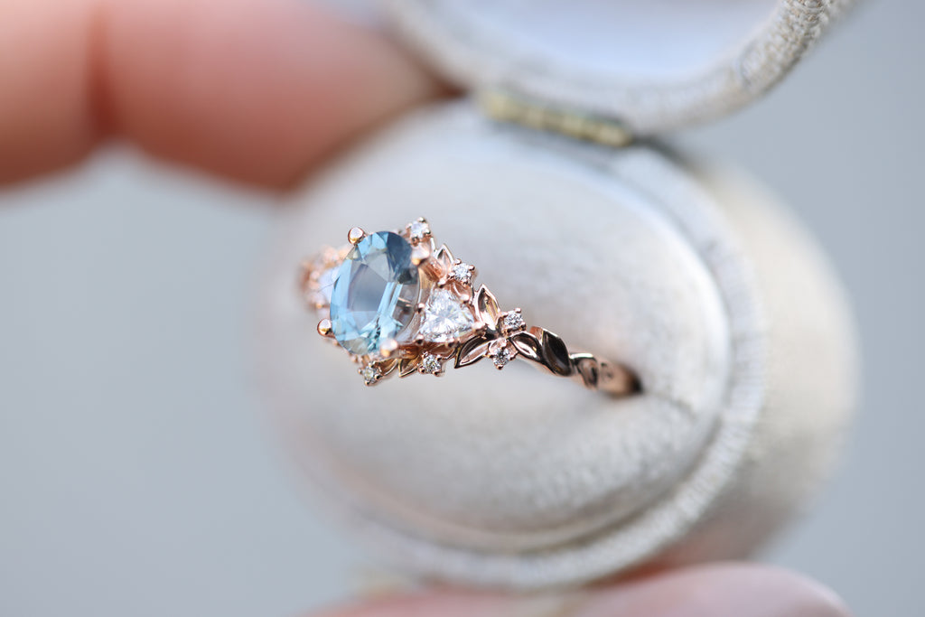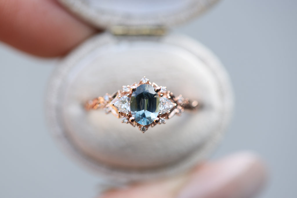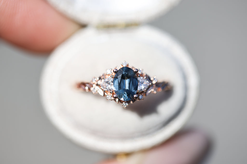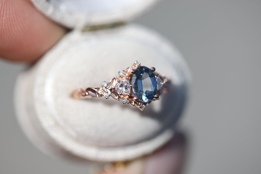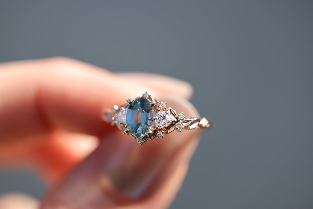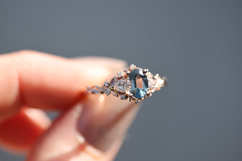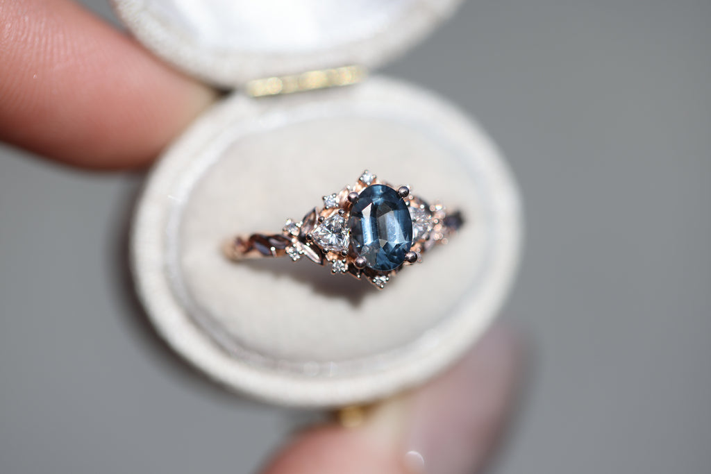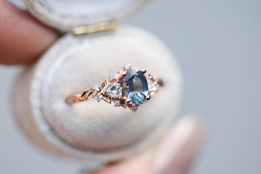 Briar Rose Three Stone with 7x5mm oval grey spinel center