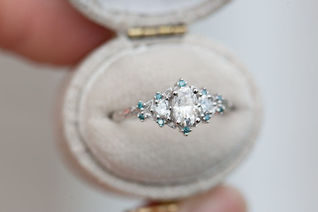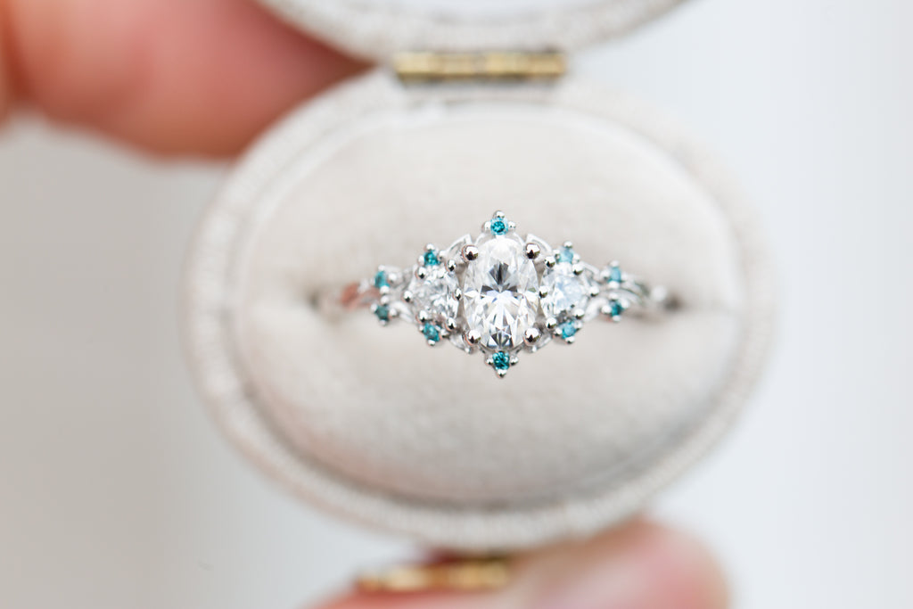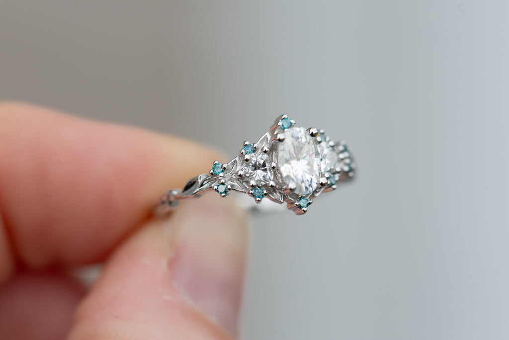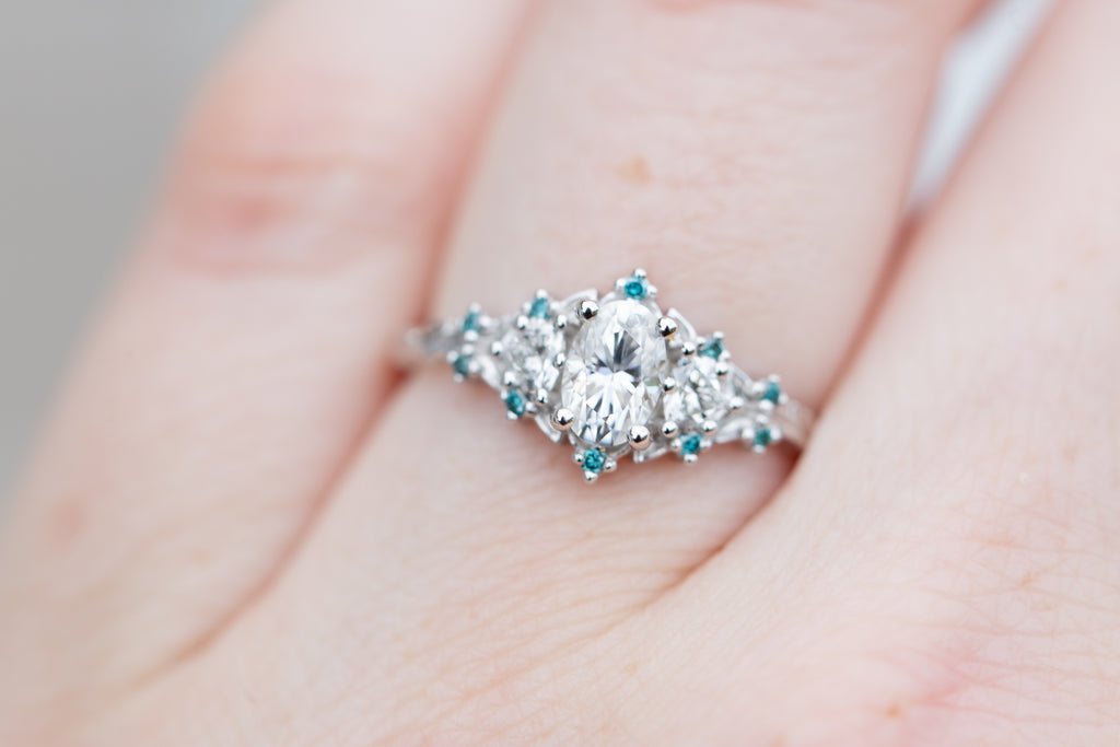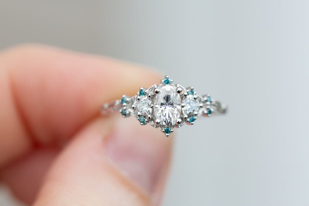 Briar rose three stone with moissanite and blue teal irradiated diamond accents