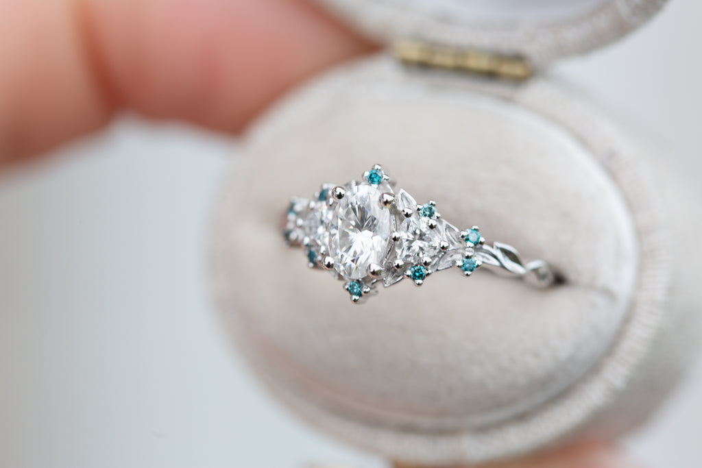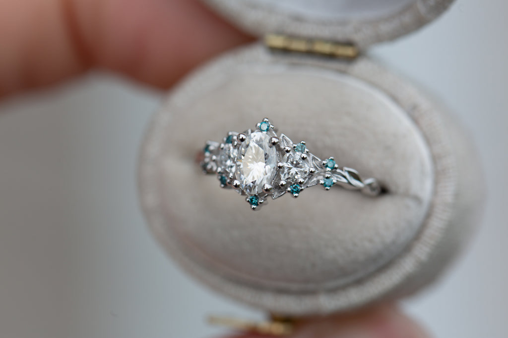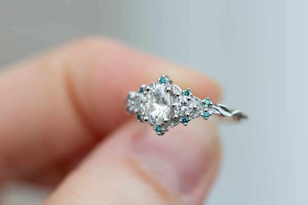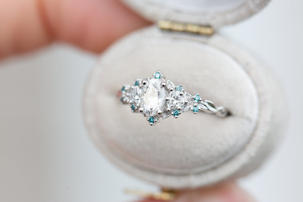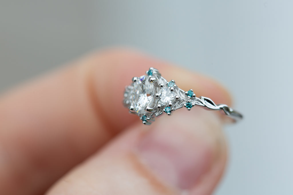 Briar rose three stone with moissanite and blue teal irradiated diamond accents