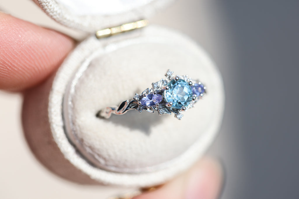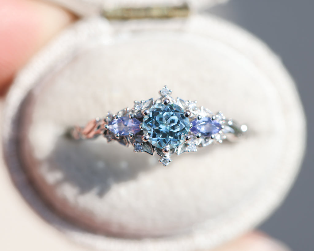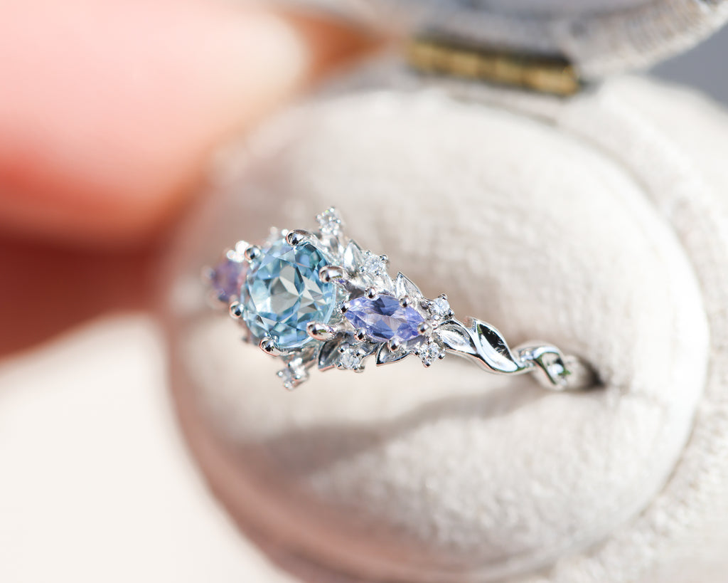 Briar rose three stone with round aquamarine center and marquise tanzanite sides