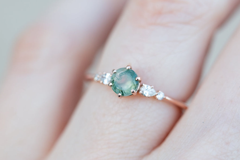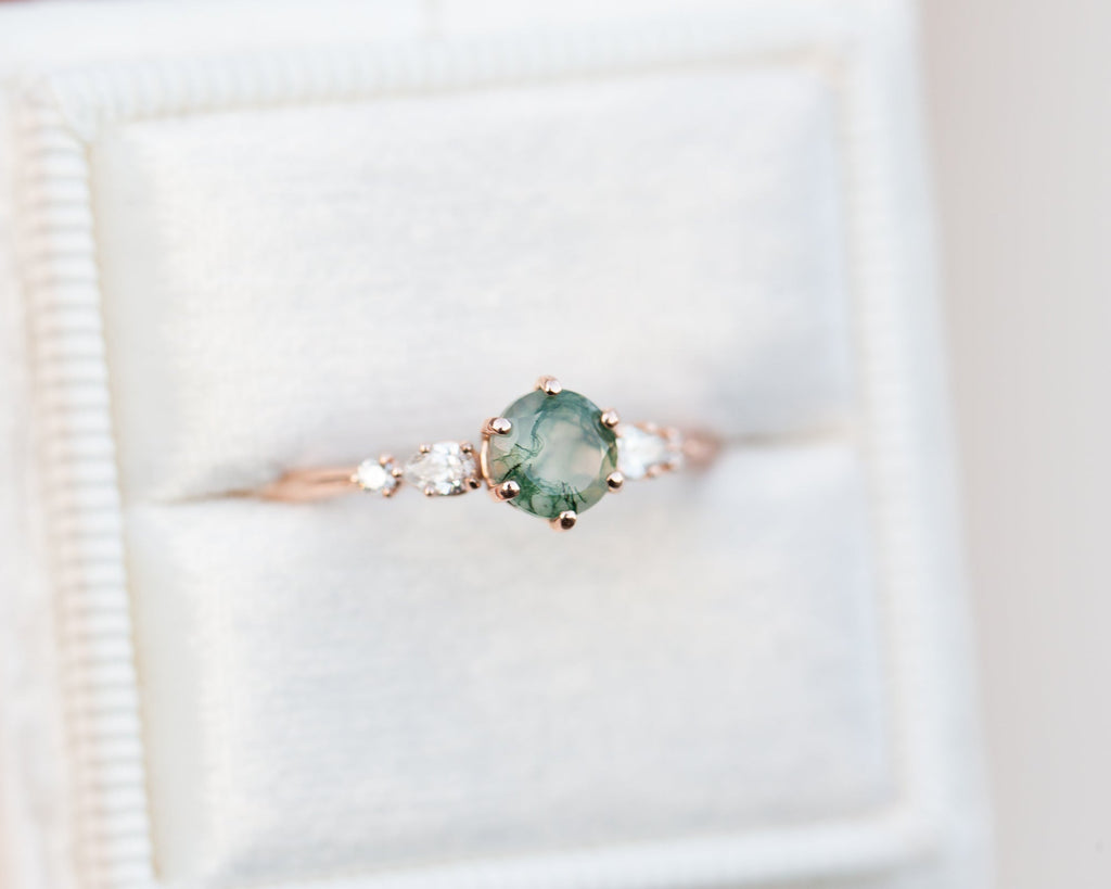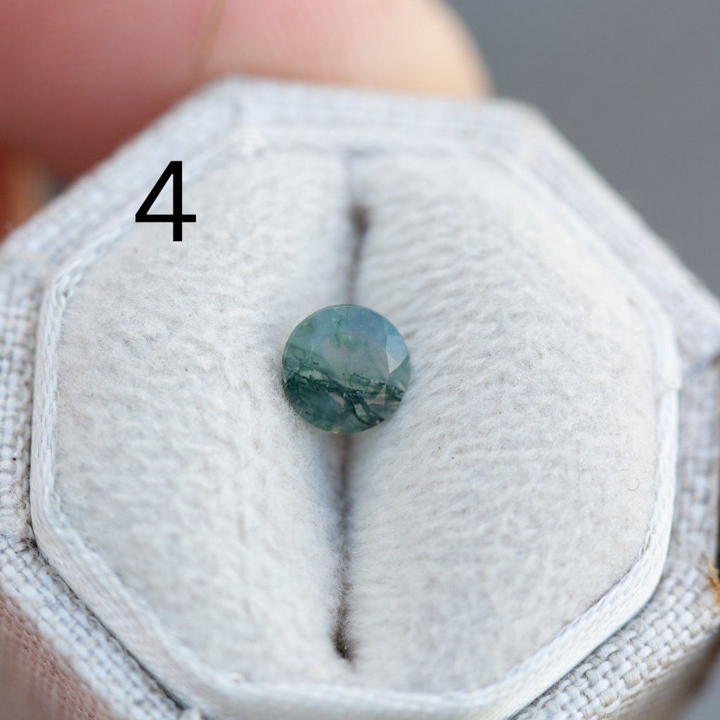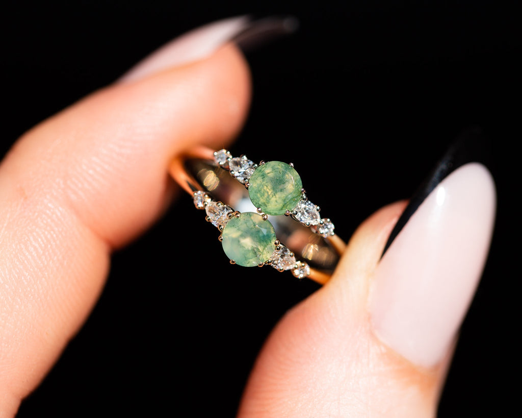 -Main stone is a 5mm moss agate, stone 1 is in the sample. Moss agate is a softer stone so will require more care (like moonstone).