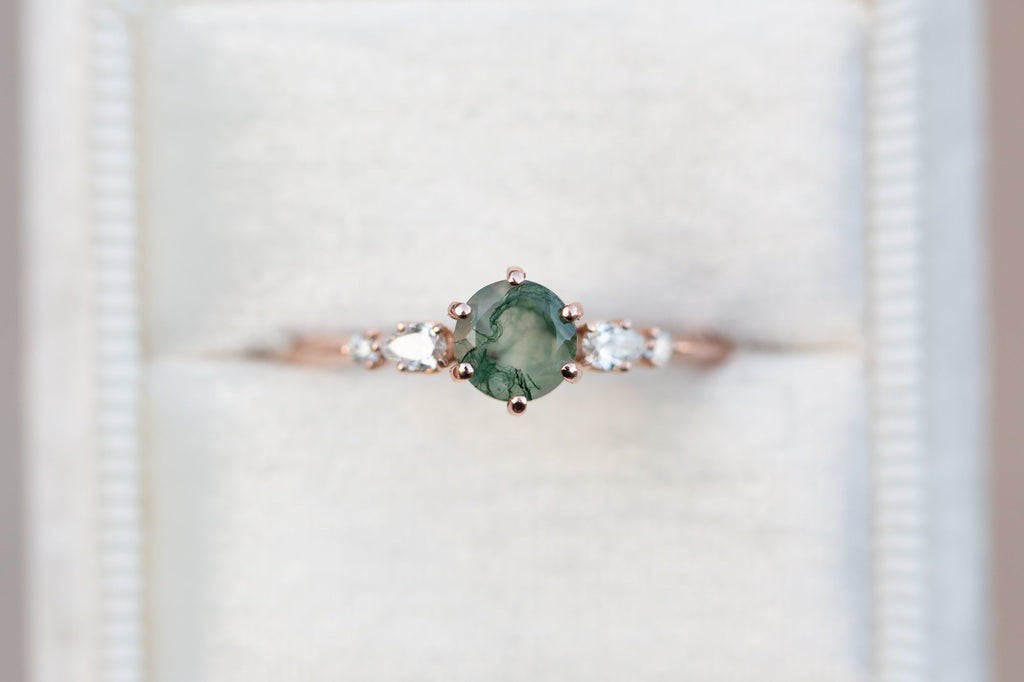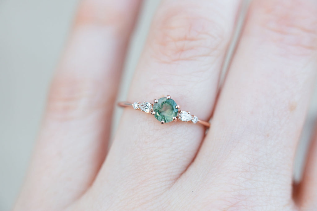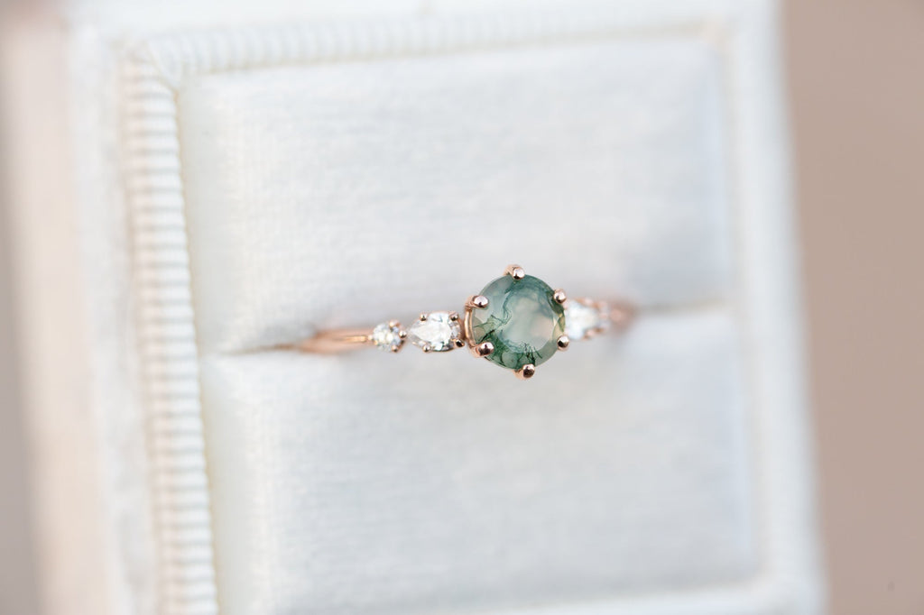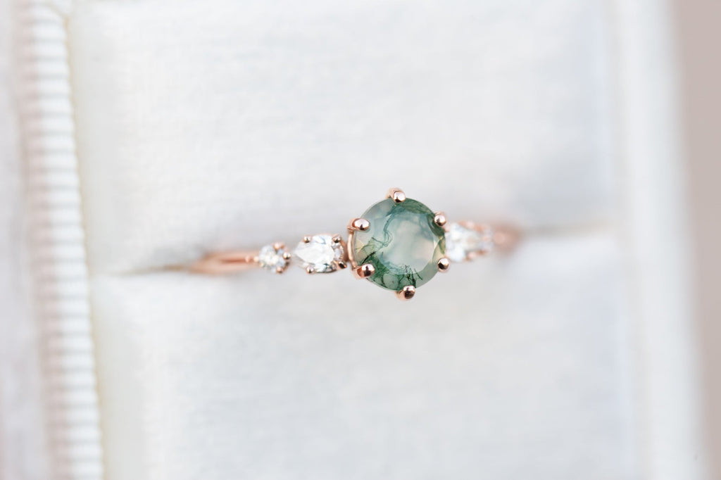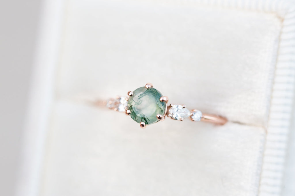 -Main stone is a 5mm moss agate, stone 1 is in the sample. Moss agate is a softer stone so will require more care (like moonstone).