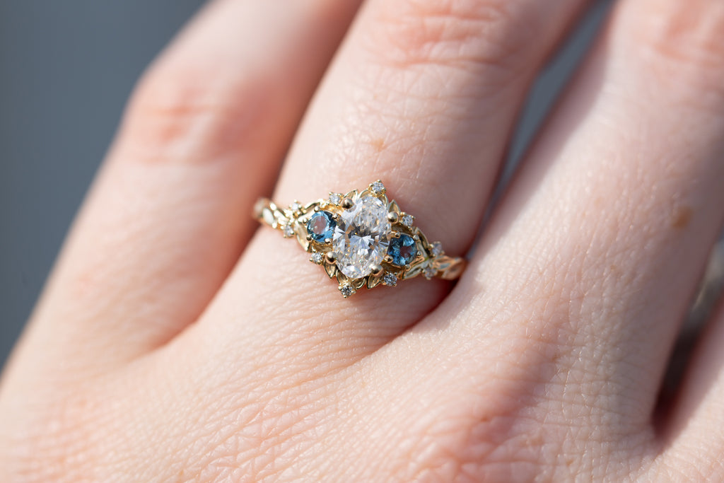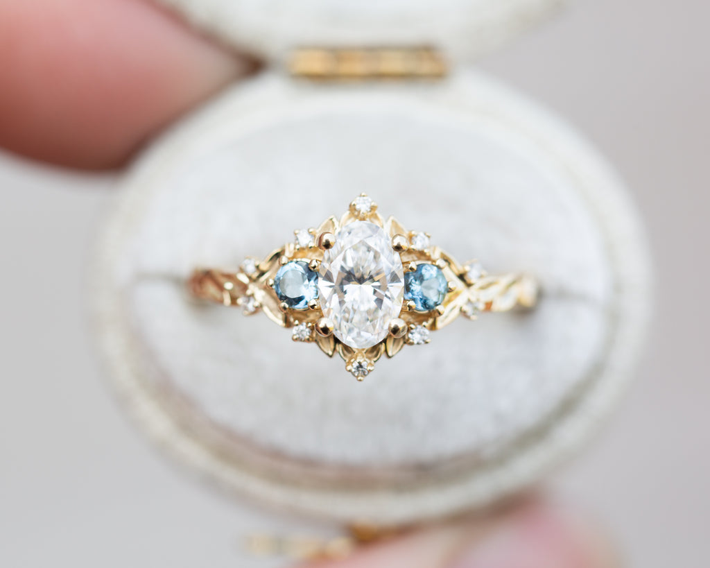 Customize your own 7x5mm oval Briar Rose Three Stone with round side stones