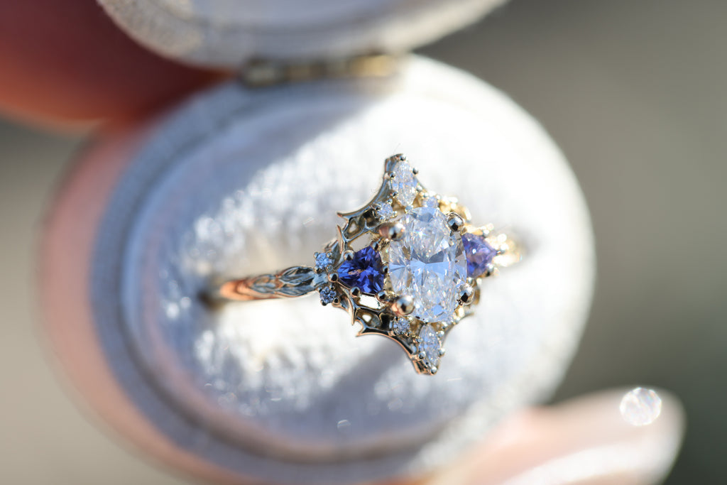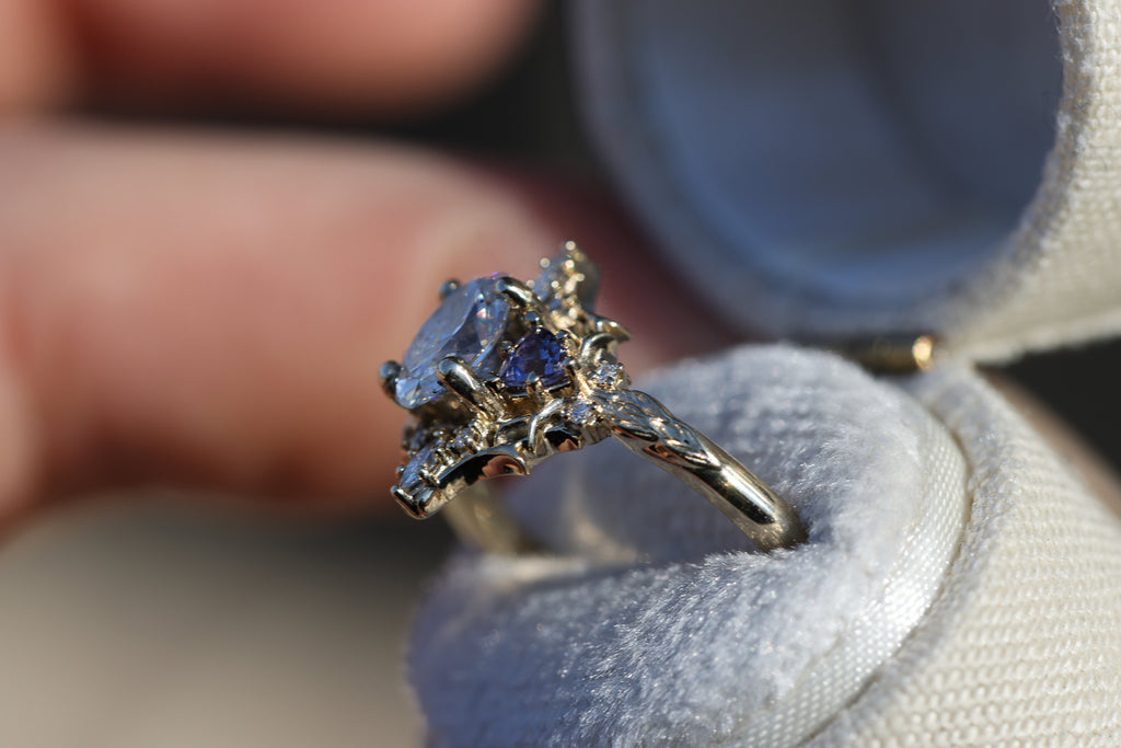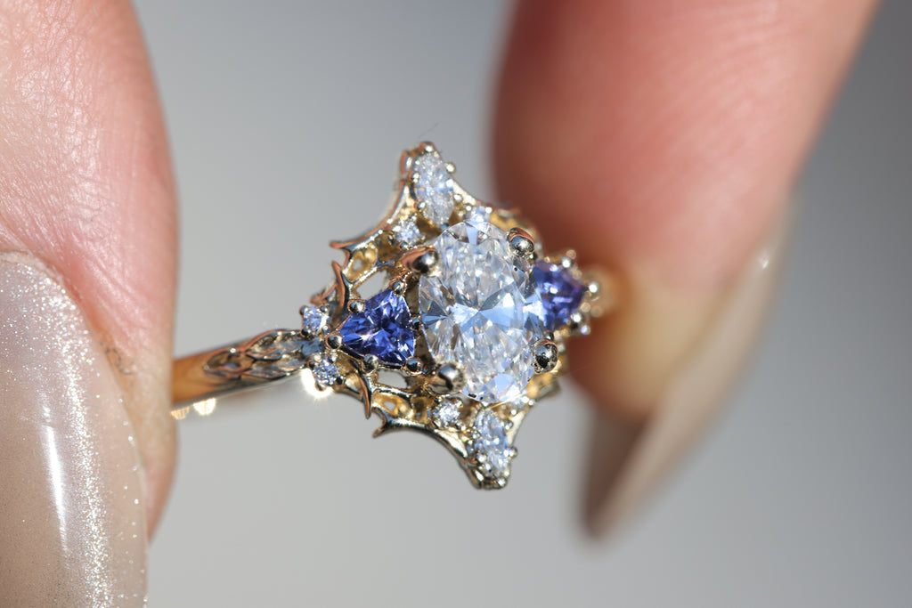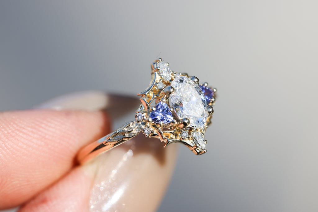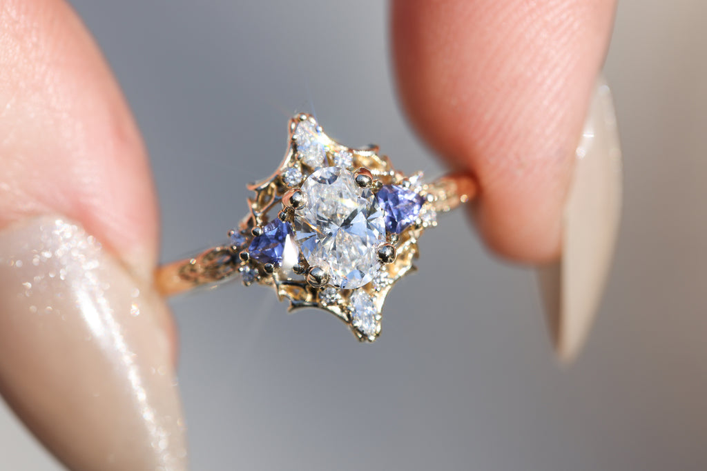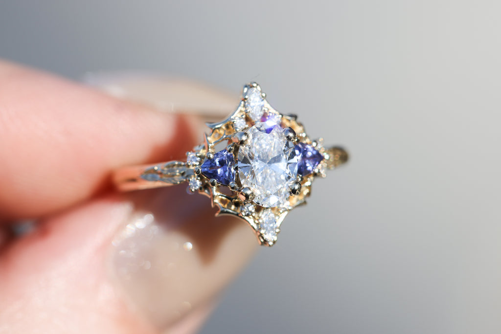Olenna "Queen of Thorns" with 7x5mm oval moissanite center stone and tanzanite sides
