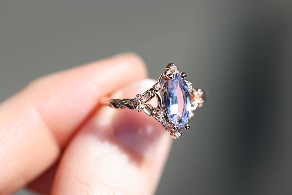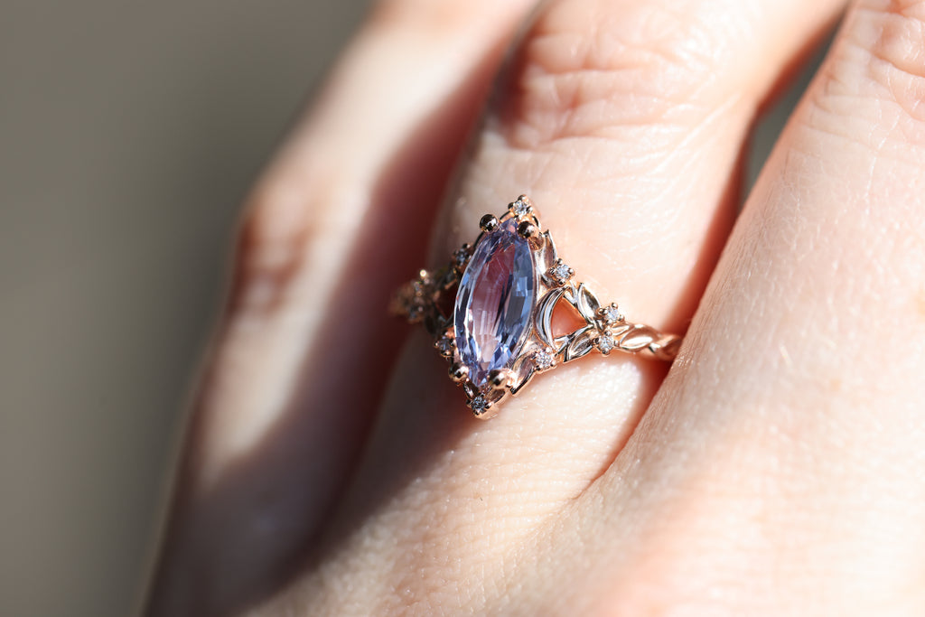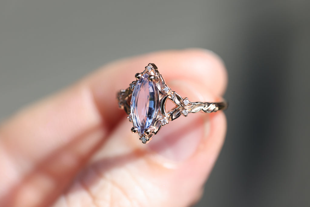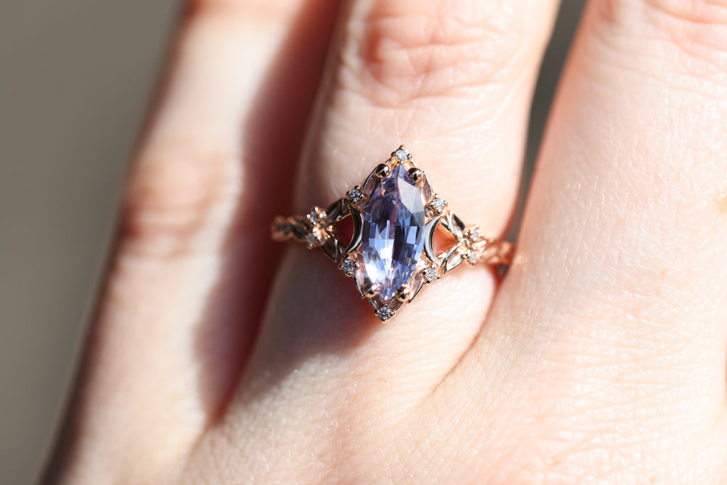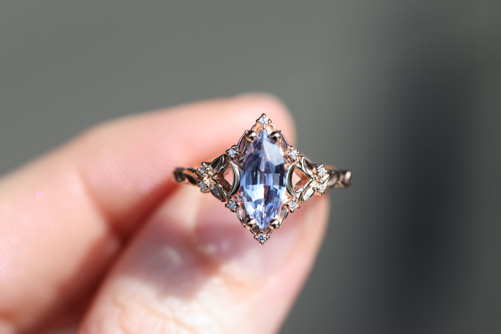 -Center stone: 1.19ct 11.14x5.1mm marquise lavender sapphire, unheated Madagascar some small inclusions