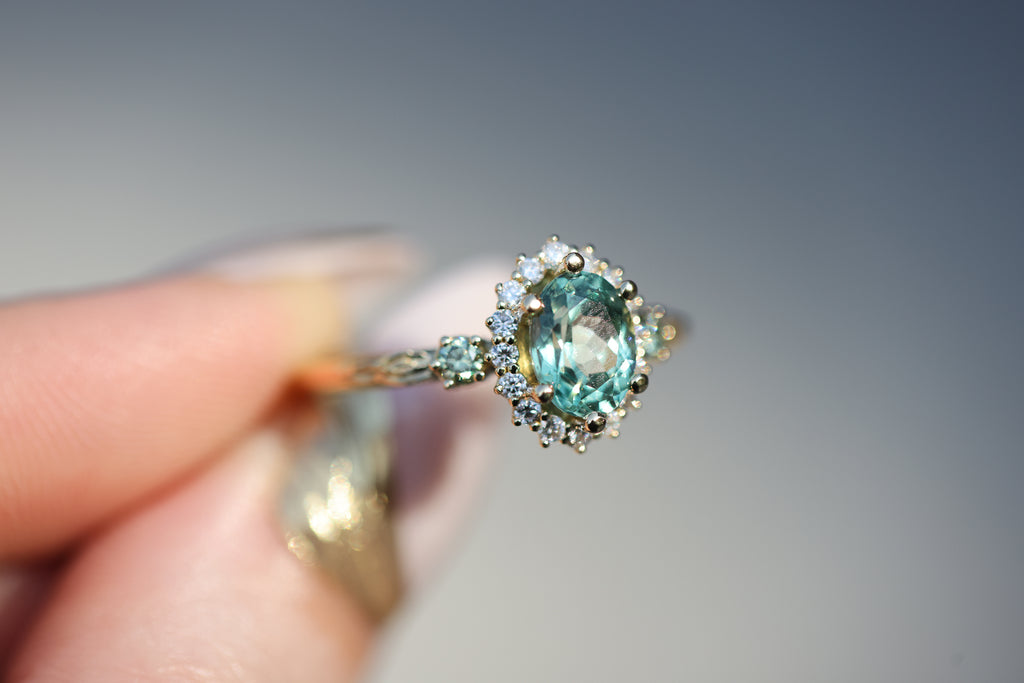 Ready to ship, 8.75 18k yellow Ash setting with lab green sapphire