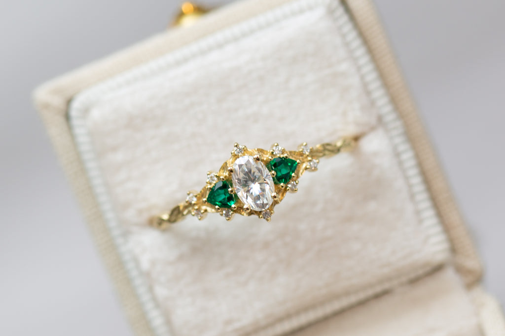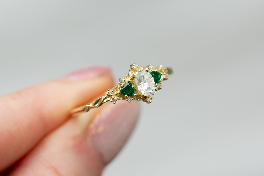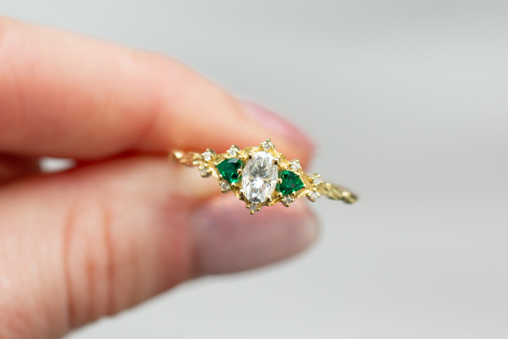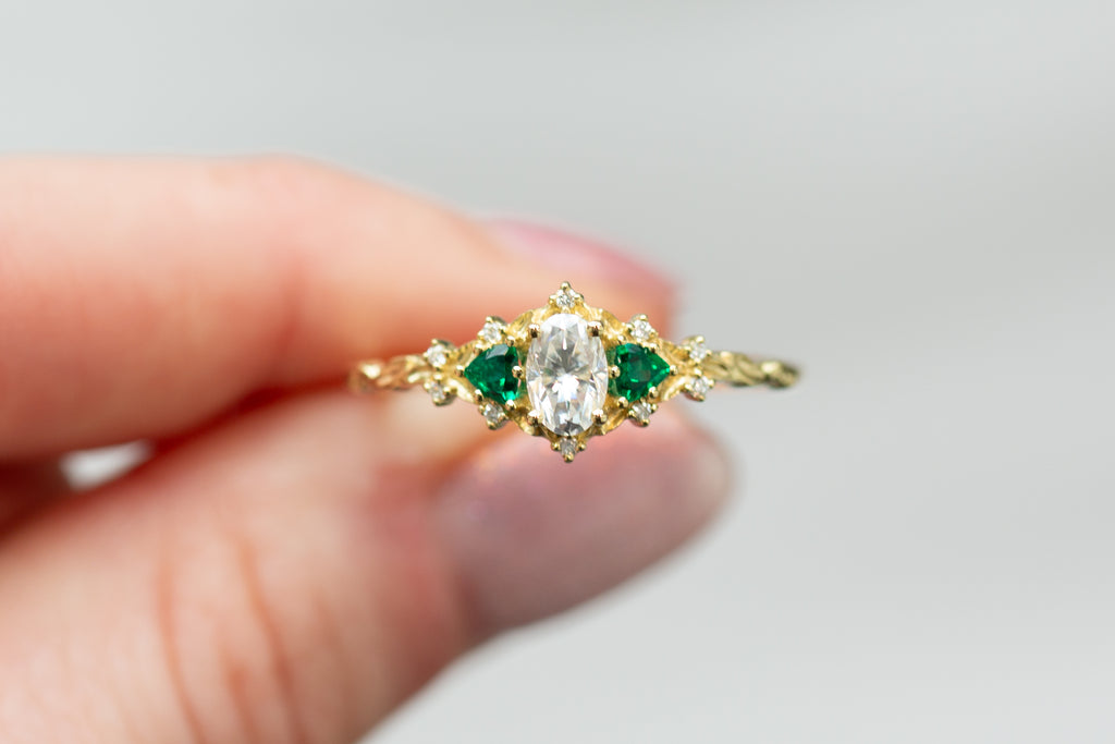 -Sides/Accents: 3mm trillion lab emerald, 1mm lab diamonds