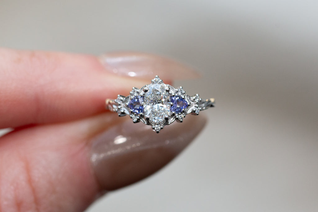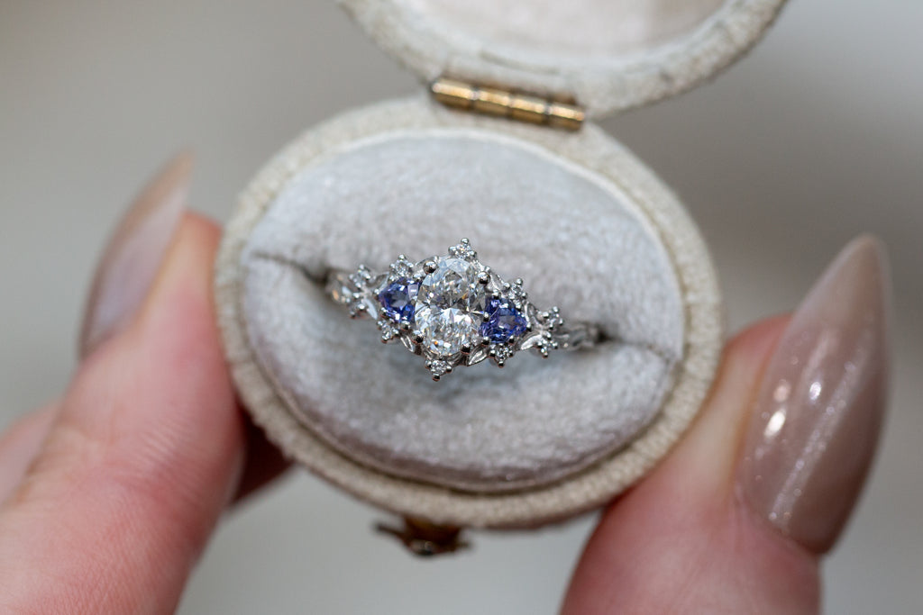 Ready to ship- Size 4, platinum Briar Rose Three Stone