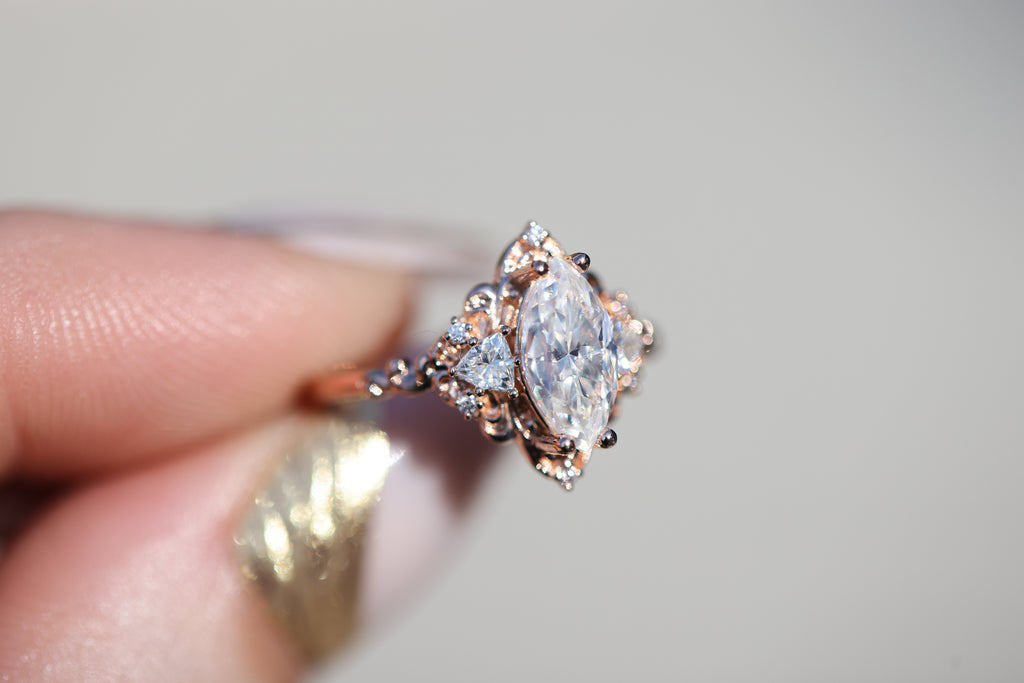 Ready to ship, Size 5 14k rose gold Aurora three stone