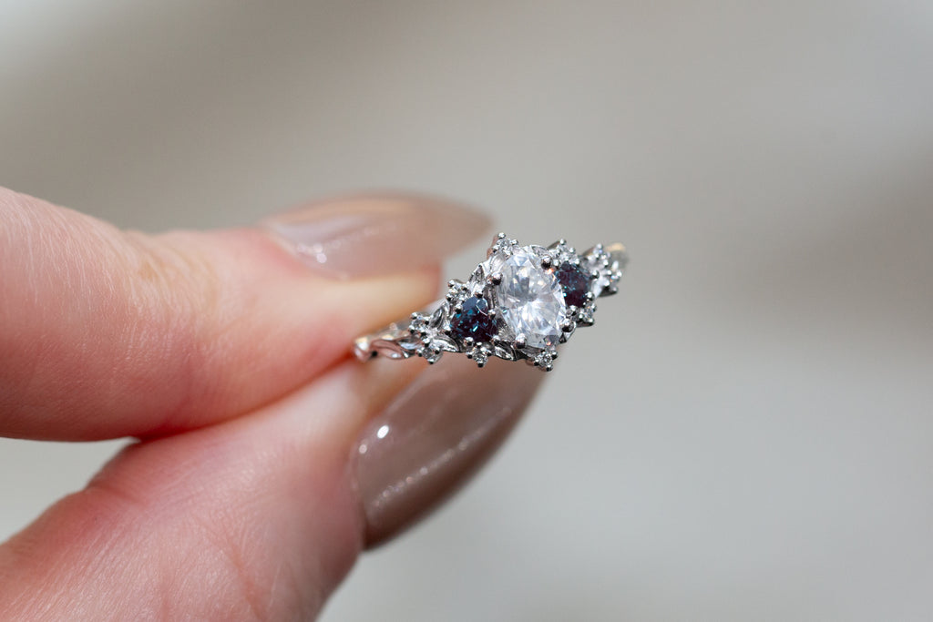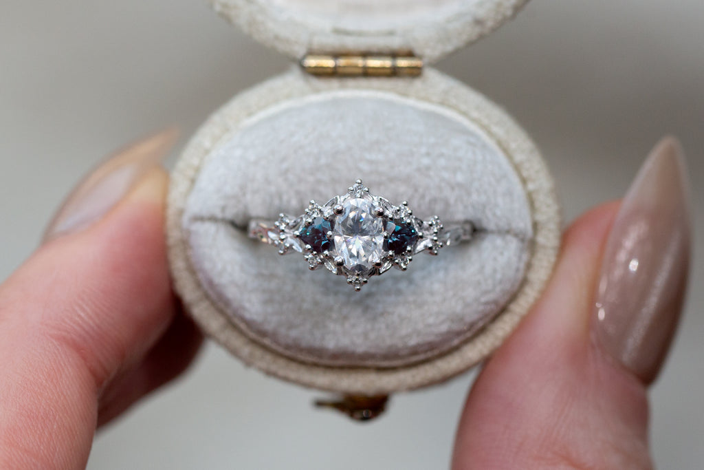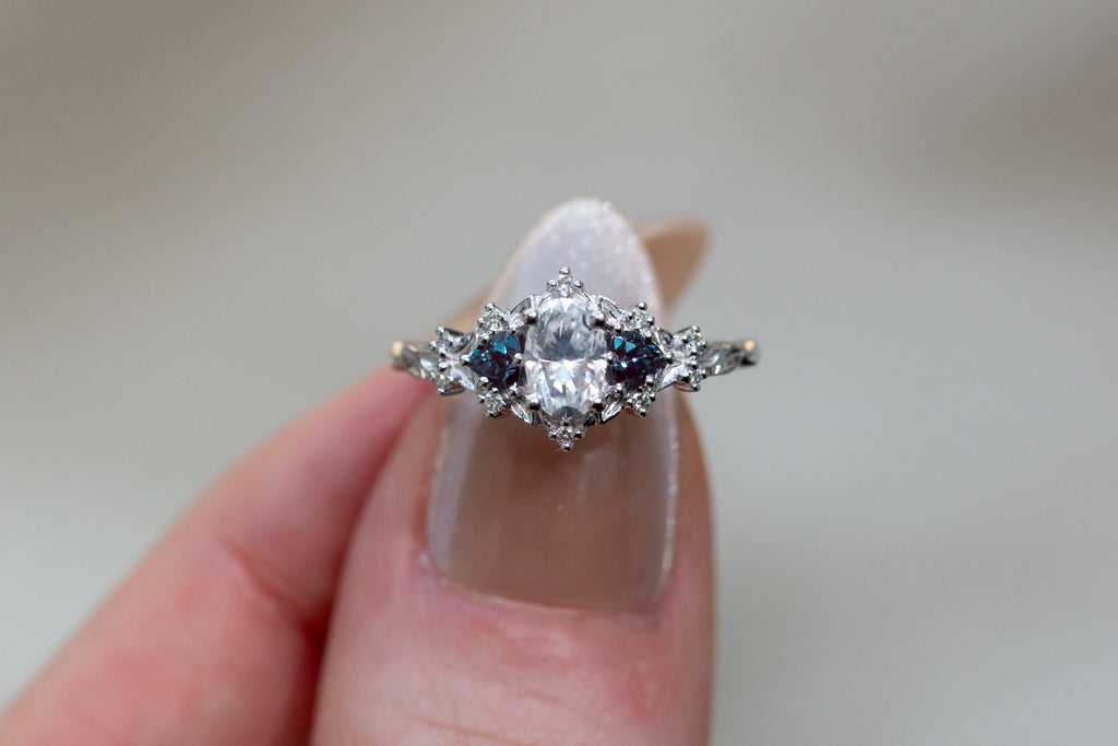 - Side/accents stones: 3mm trillion lab alexandrite, 1mm round lab diamond
