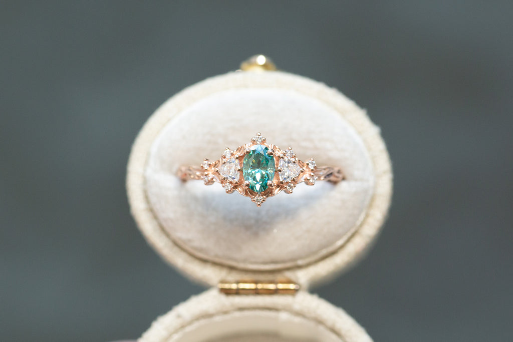 -Center: 6x4mm oval teal moissanite