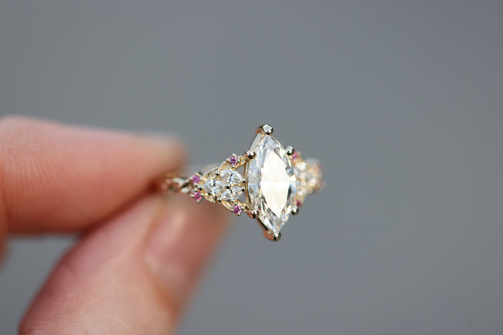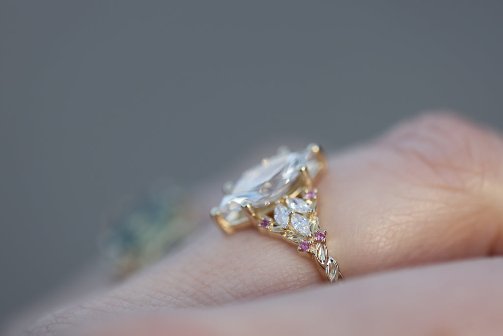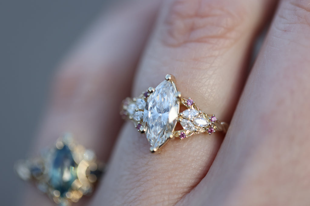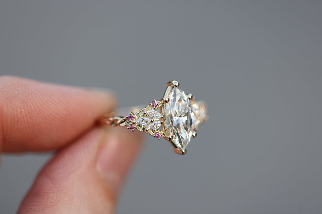 -Sides/Accents: 3x1.5mm lab diamonds, 1mm pink sapphire