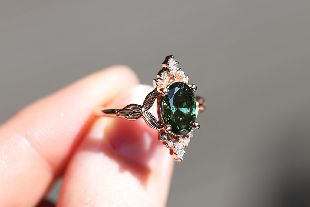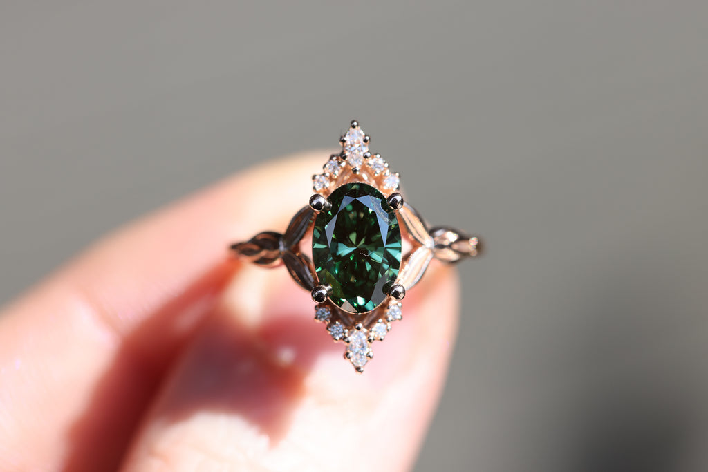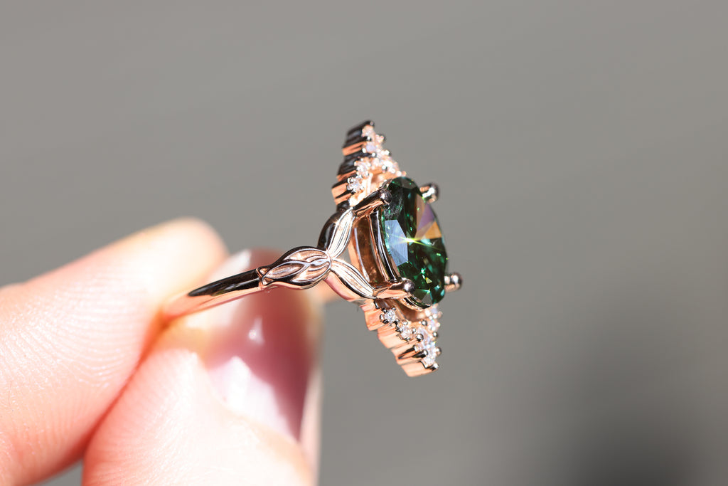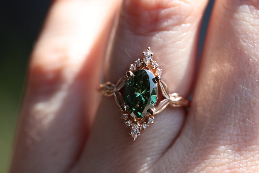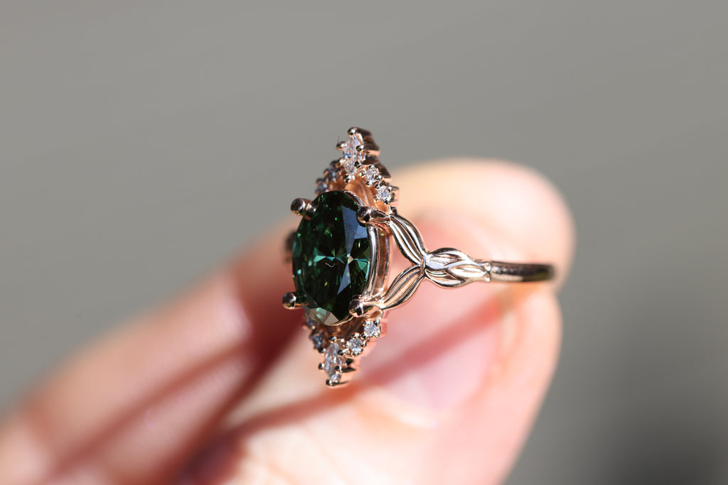 Ready to ship, Size 6.25 14k rose, Siren with oval green lab diamond