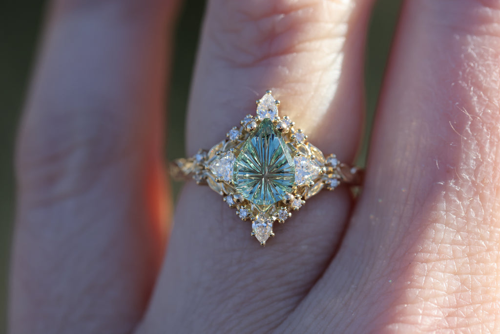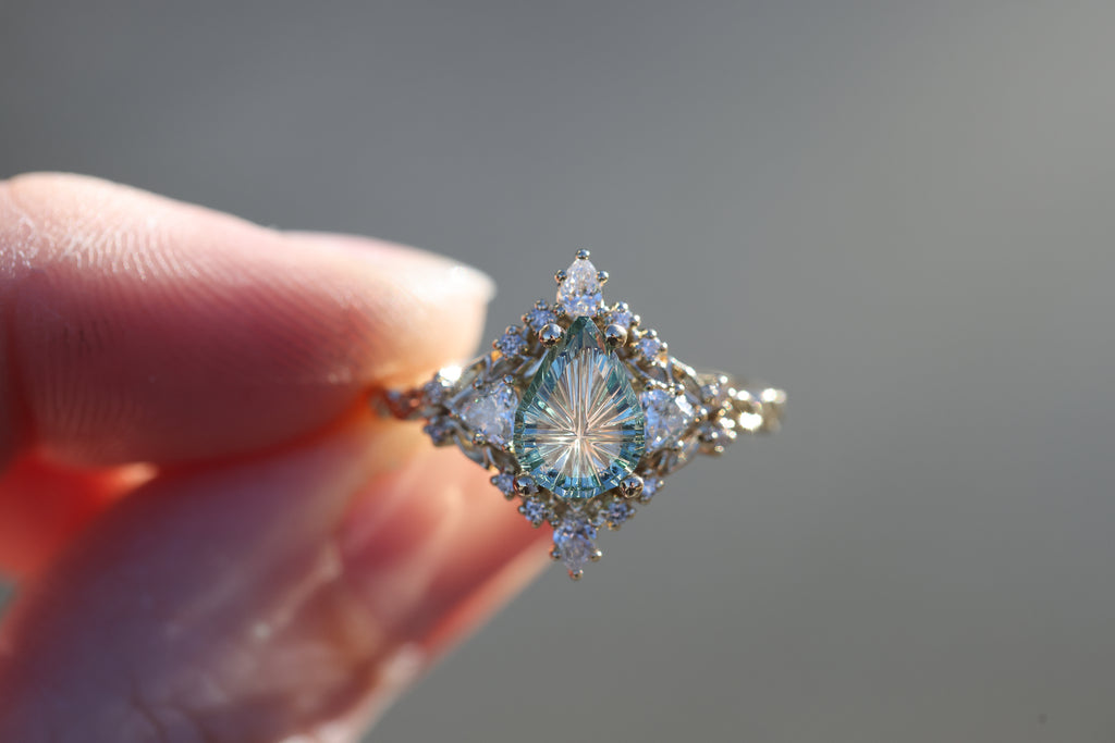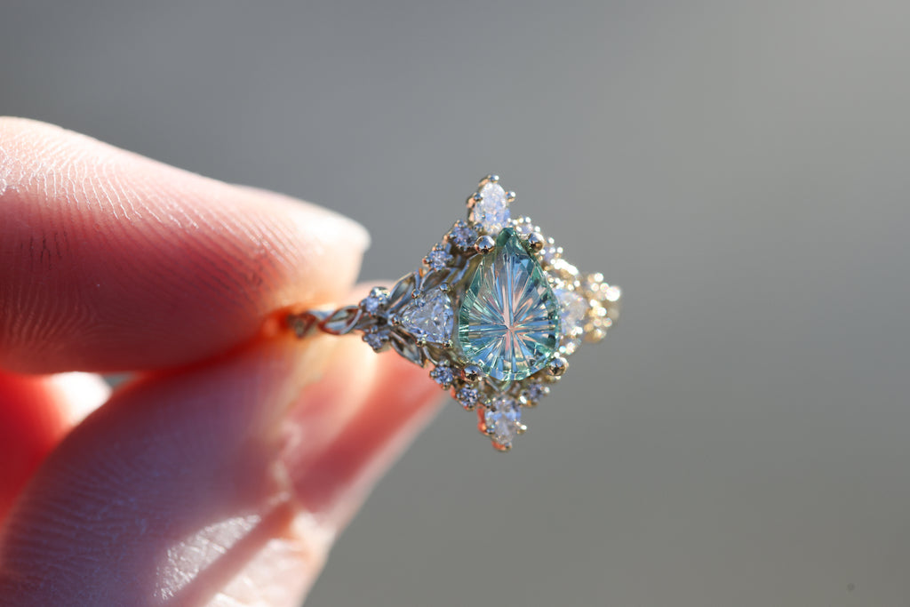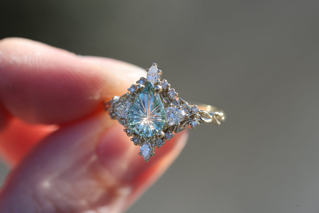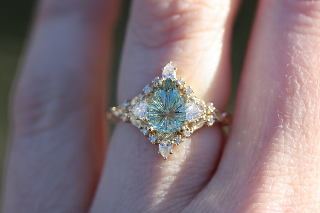 -1.29ct pear light green starbrite sapphire, cut by John Dyer. This stone is a fully light green/mint color, the lighting in the pictures was just reflecting the yellow gold through the middle of the stone. 8.7x6.3mm, Montana mostly eye clean, unheated