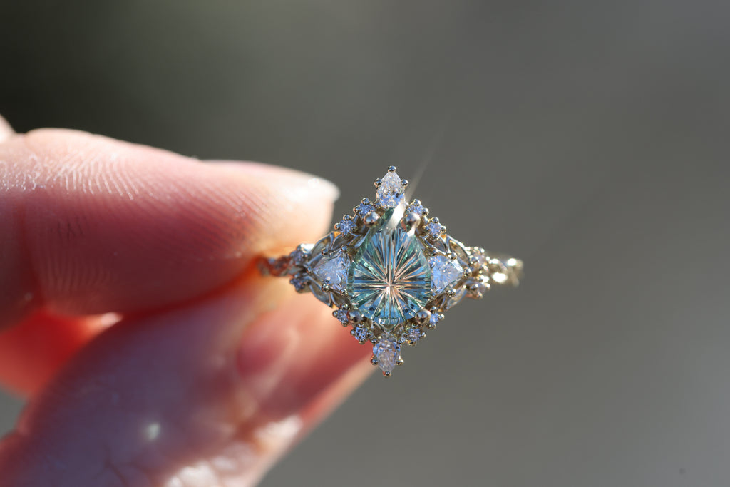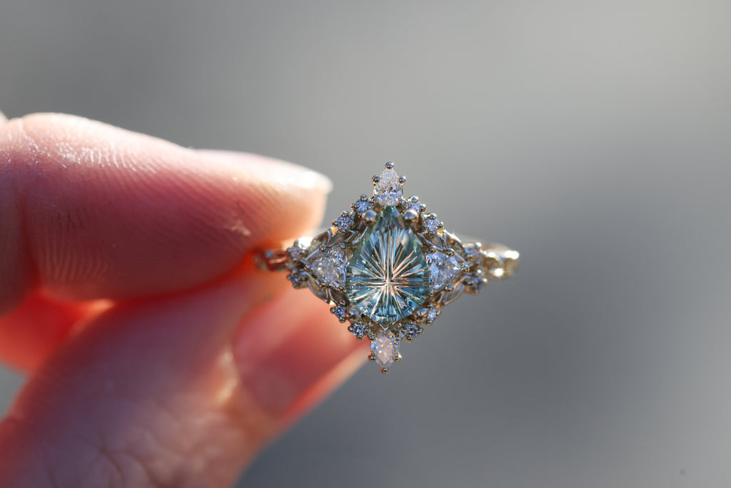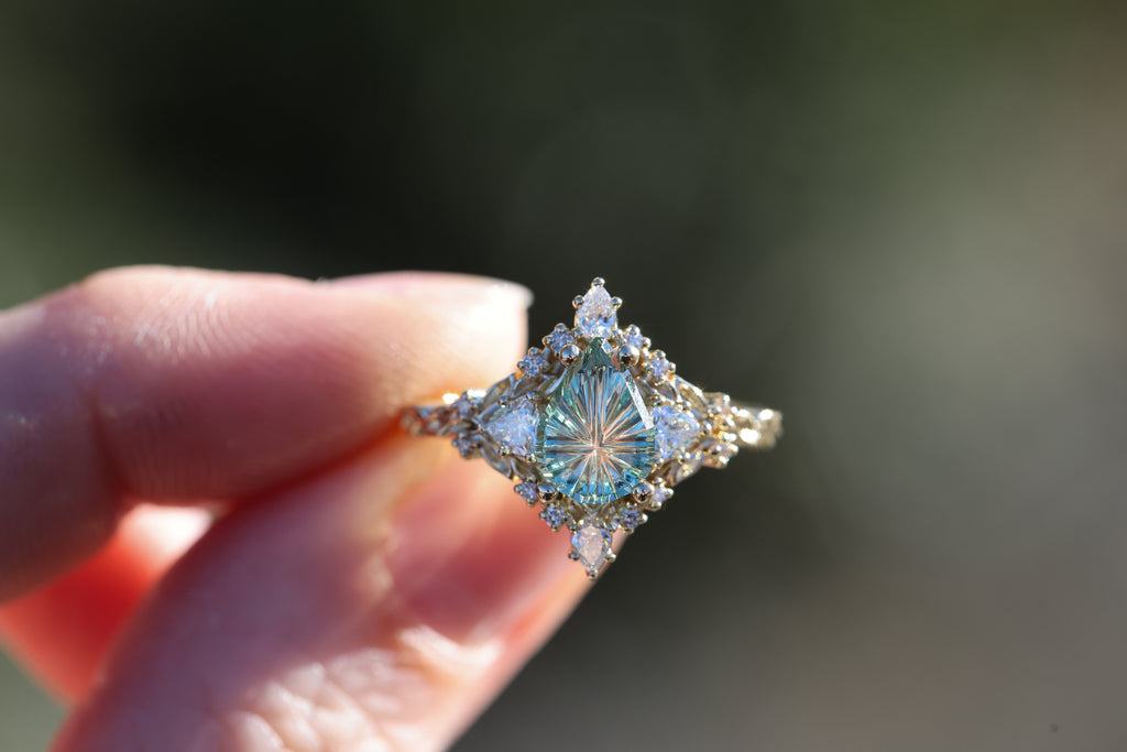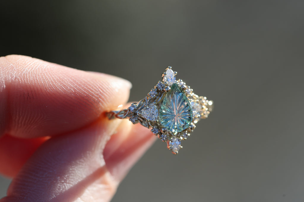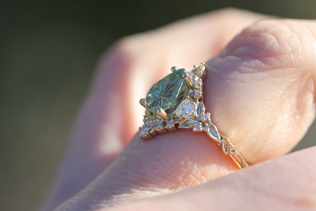 -1.29ct pear light green starbrite sapphire, cut by John Dyer. This stone is a fully light green/mint color, the lighting in the pictures was just reflecting the yellow gold through the middle of the stone. 8.7x6.3mm, Montana mostly eye clean, unheated