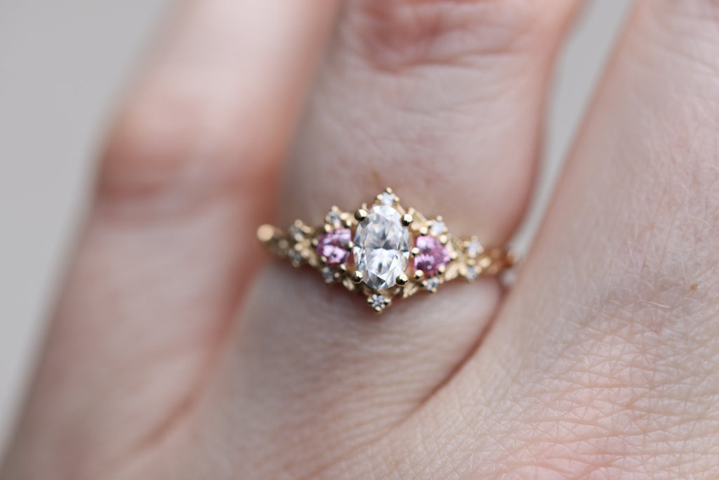 READY TO SHIP- Size 6.25, 14k Yellow Gold Briar Rose Three Stone