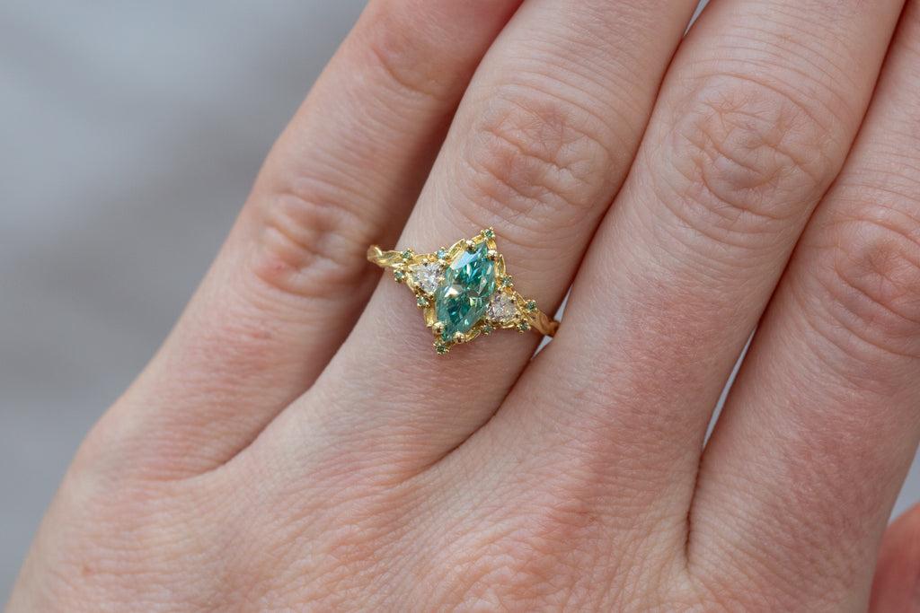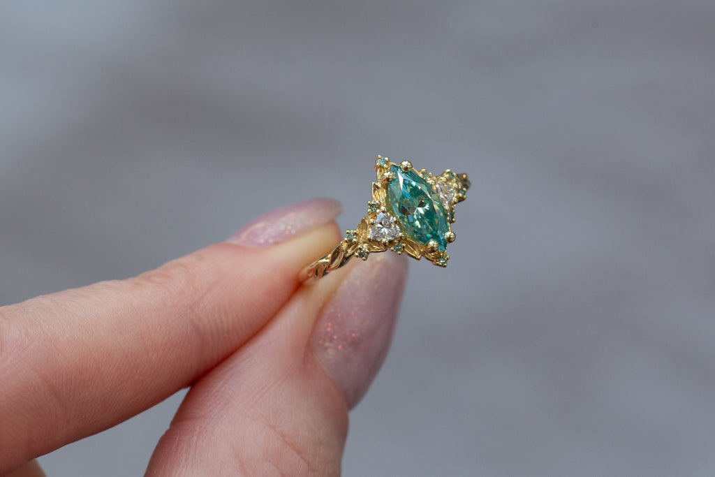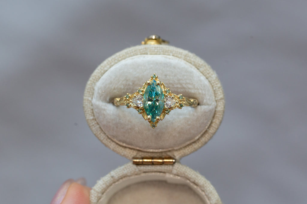 -Side/Accent Stones: 3mm trillion moissanite, 1mm mint diamond