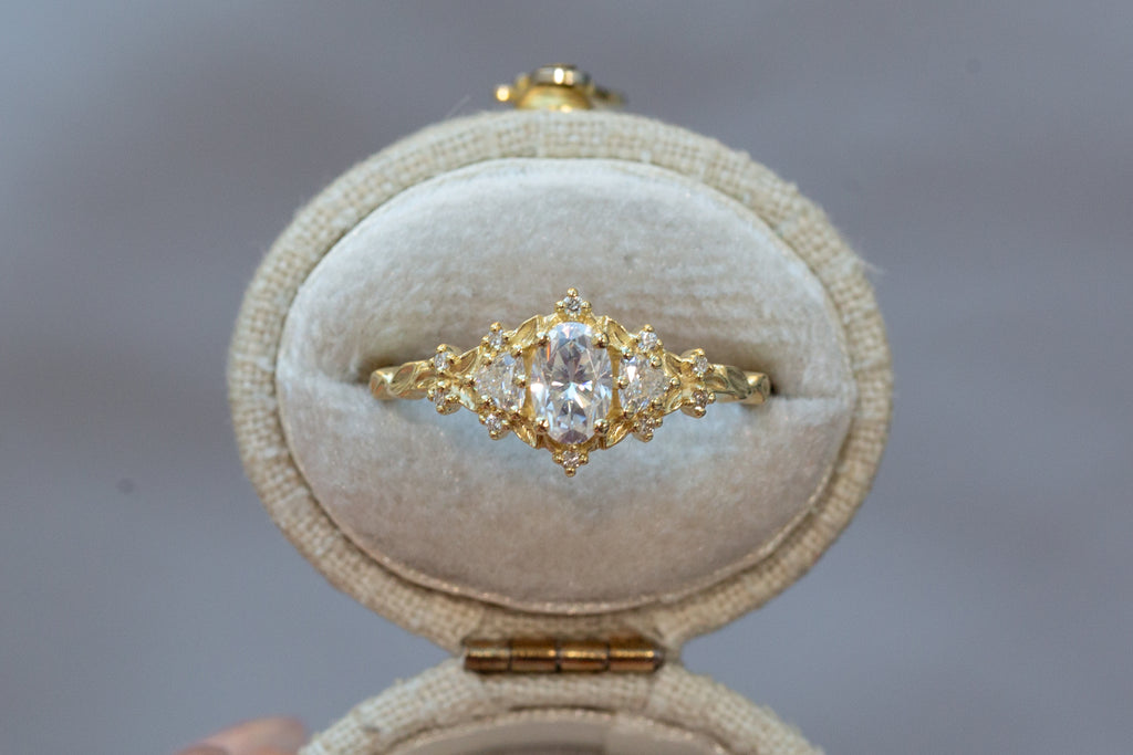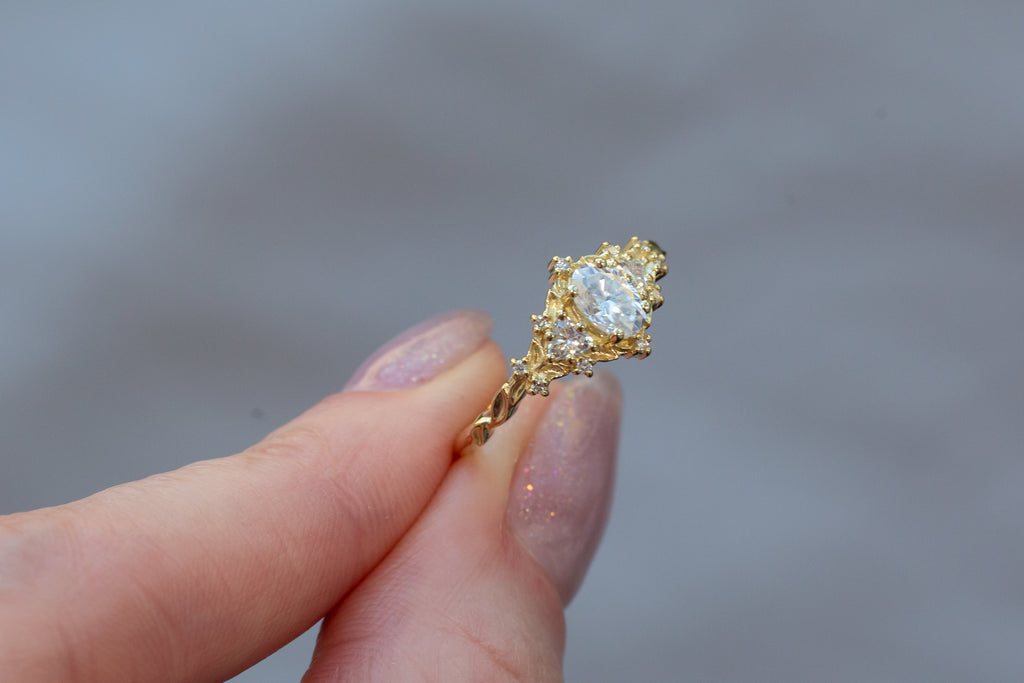 -Side/Accent Stones: 3mm trillion moissanite, 1mm lab diamond