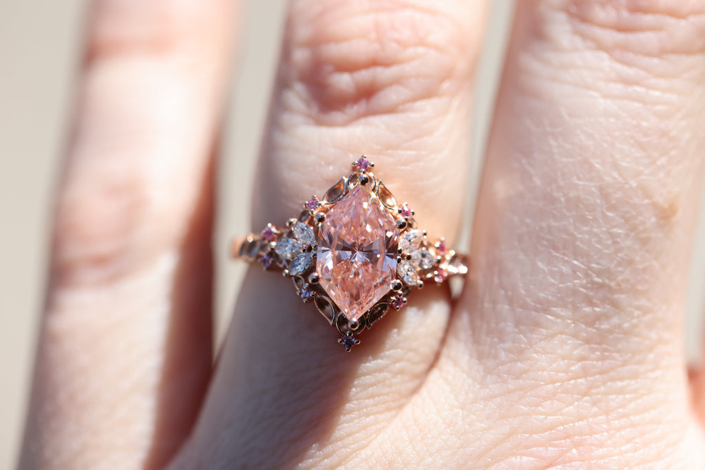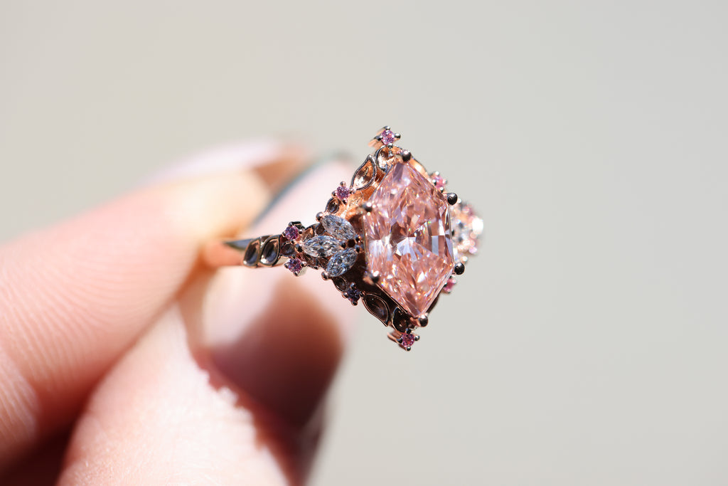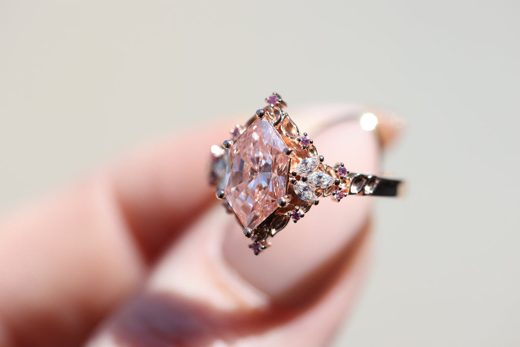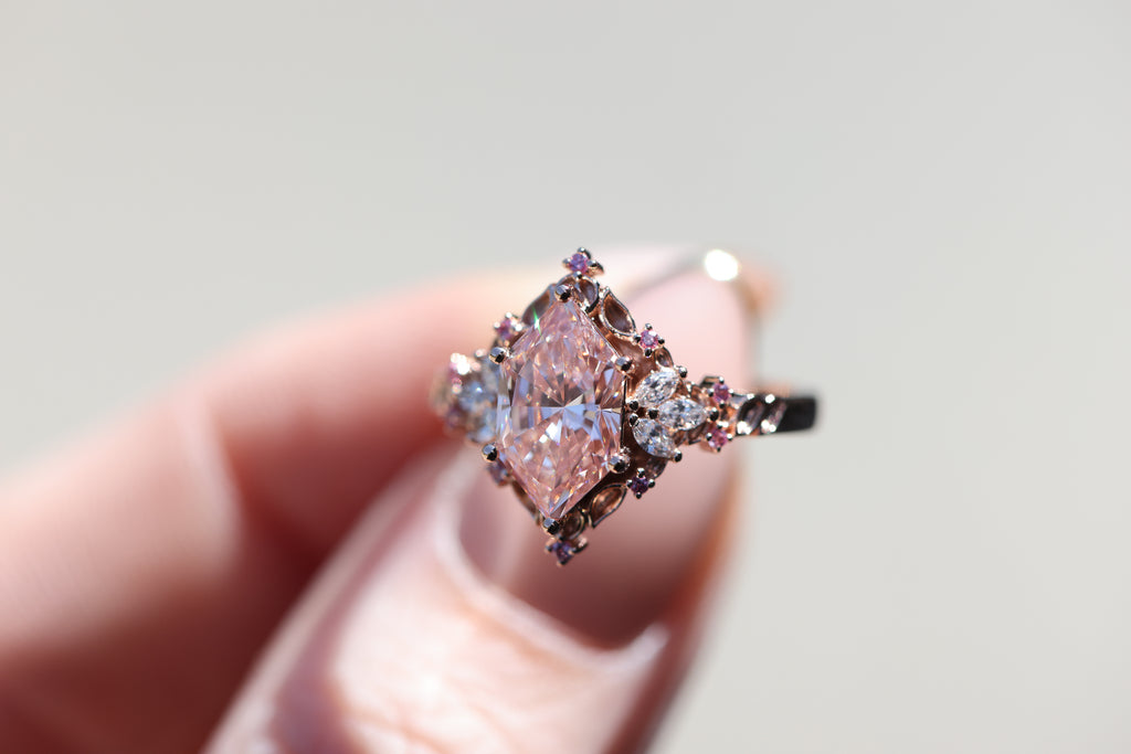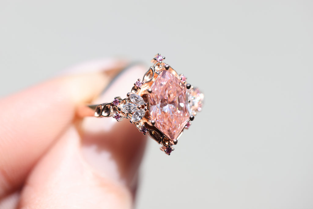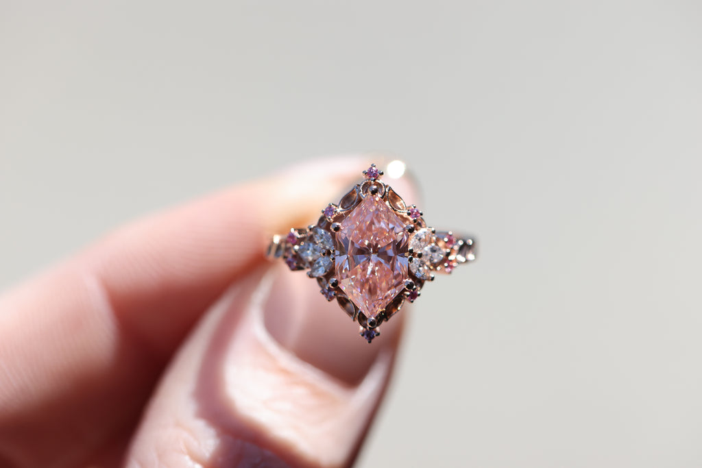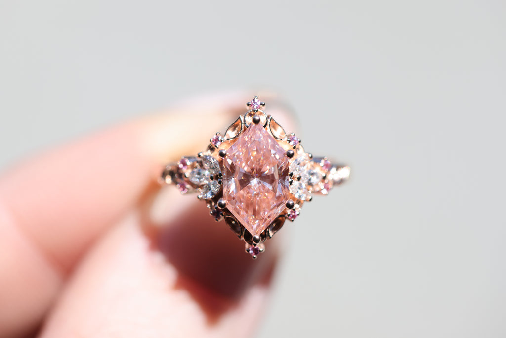 -Side/Accent Stones: 3x1.5mm lab diamond, 1mm lab light pink sapphire
