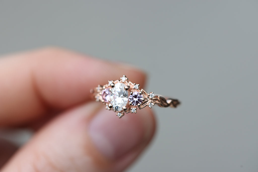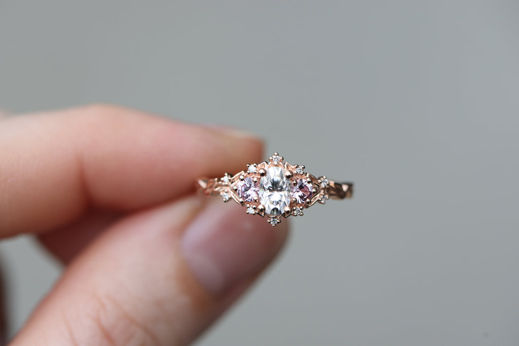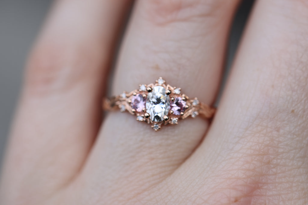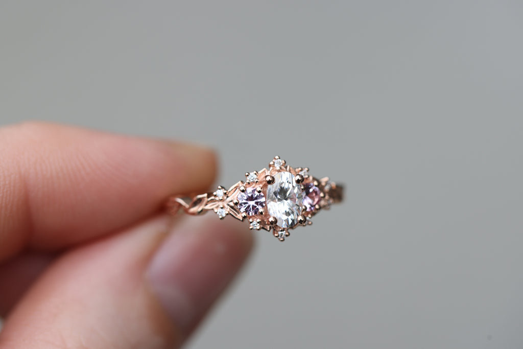 READY TO SHIP- Size 7, 14k Rose Gold Briar Rose Three Stone