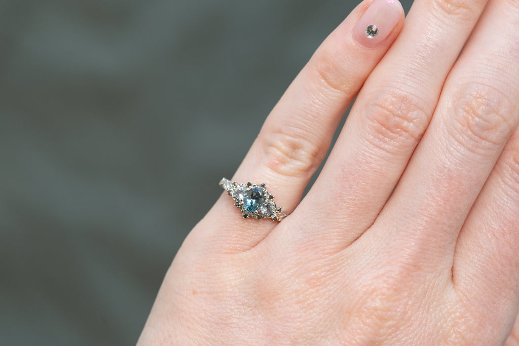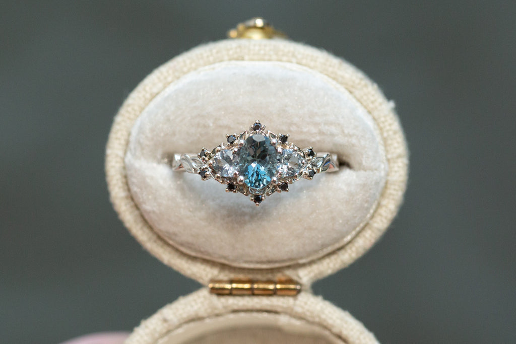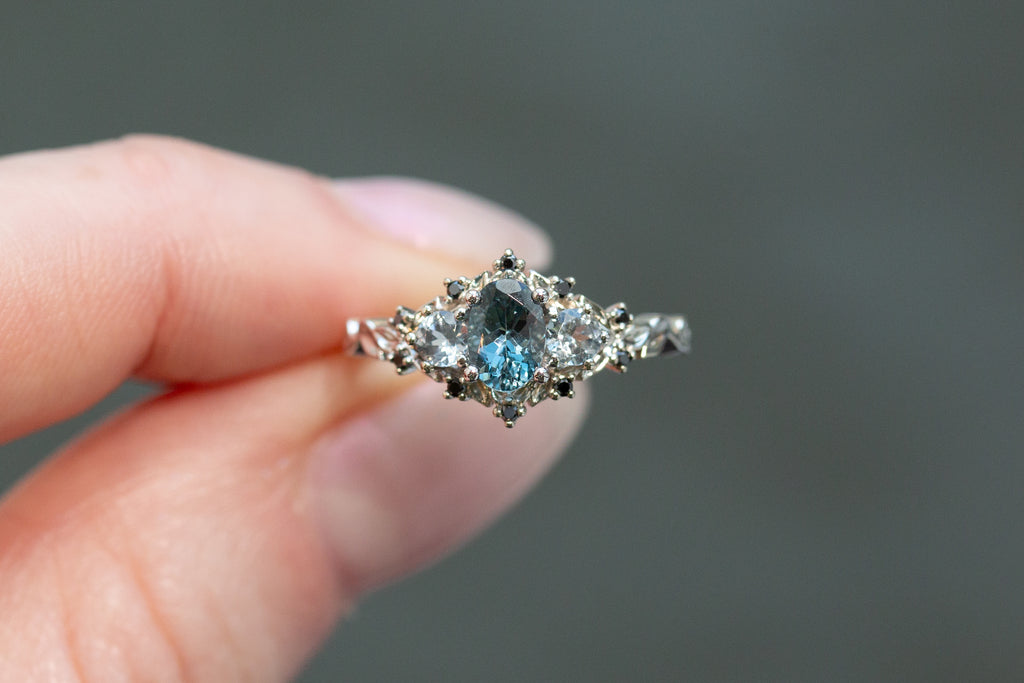 -Side/Accent Stones: 3mm round gray spinel, 1mm round black diamond