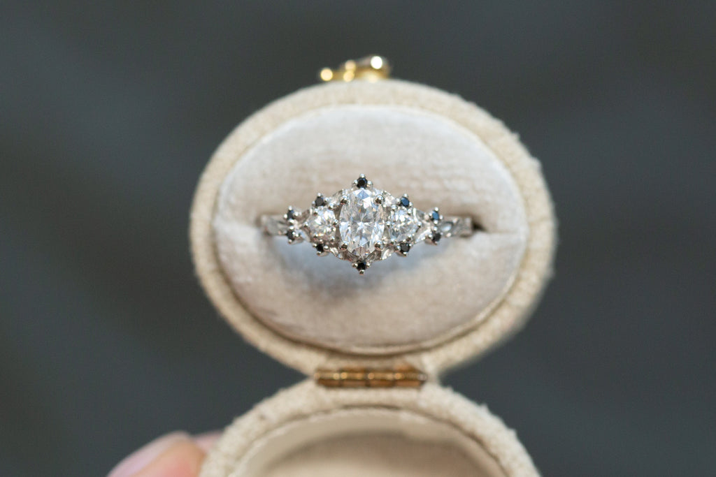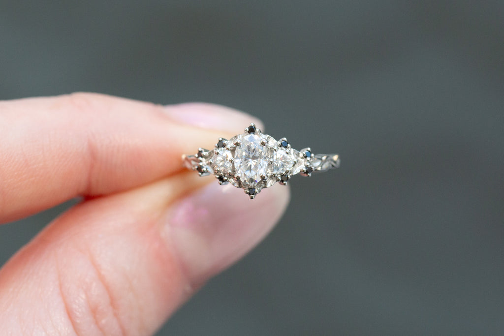 -Center stone: 6x4mm oval moissanite