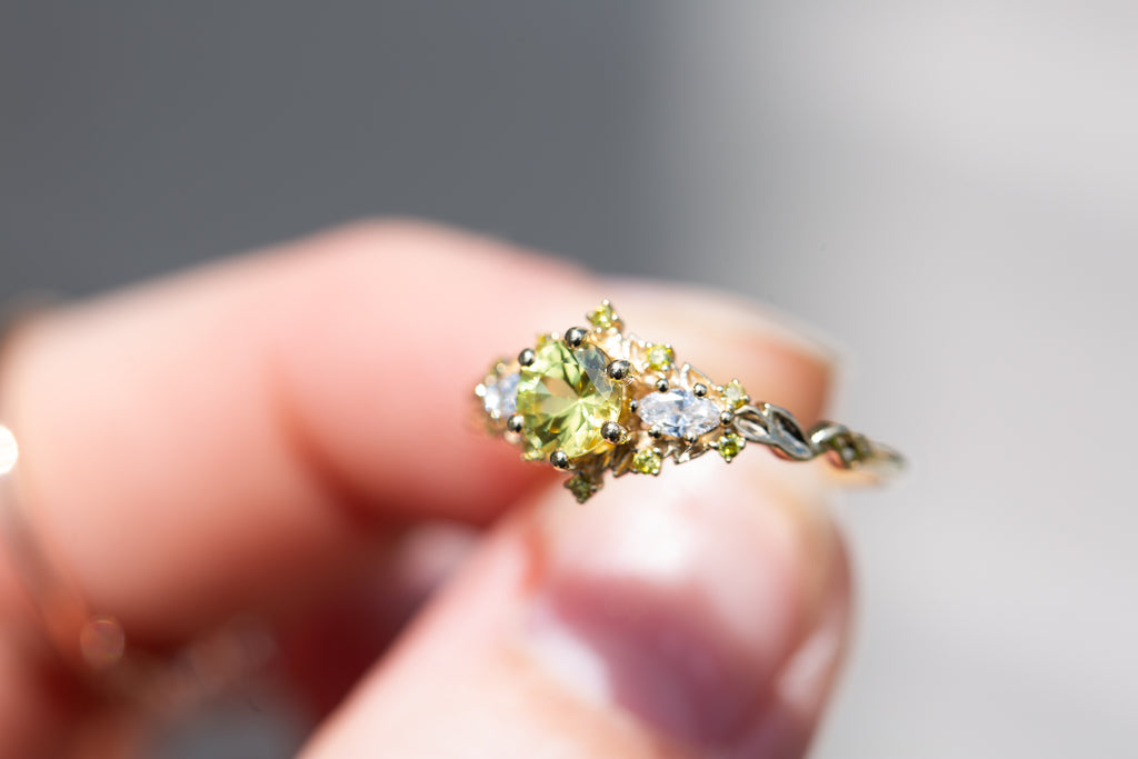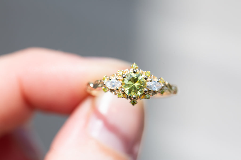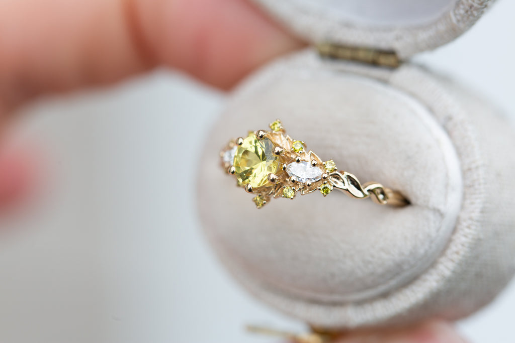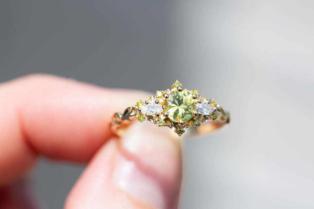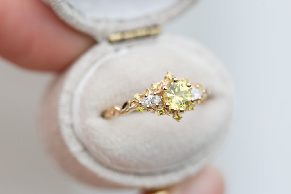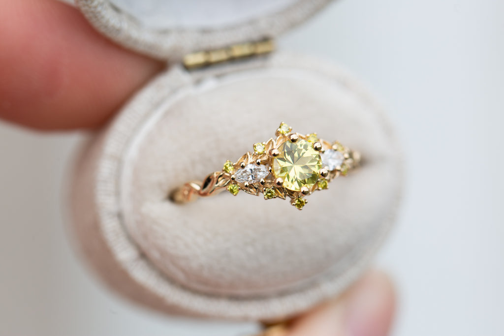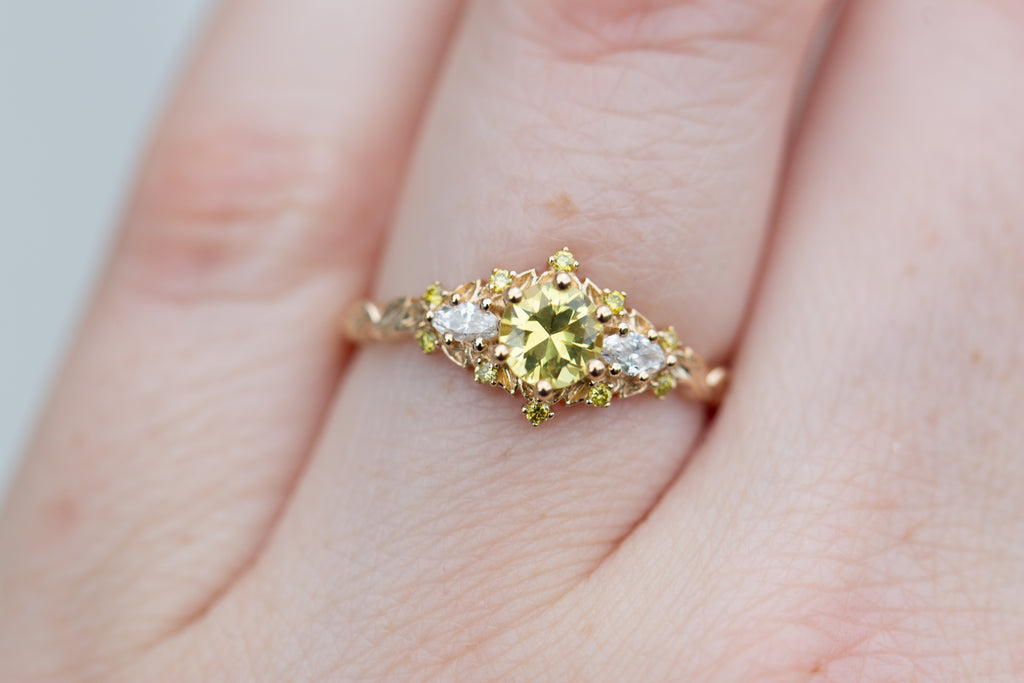 - 1mm yellow irradiated diamond accent stones placed along the leaves