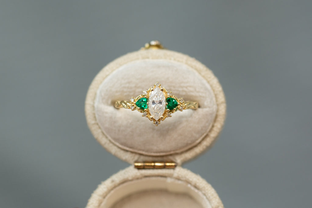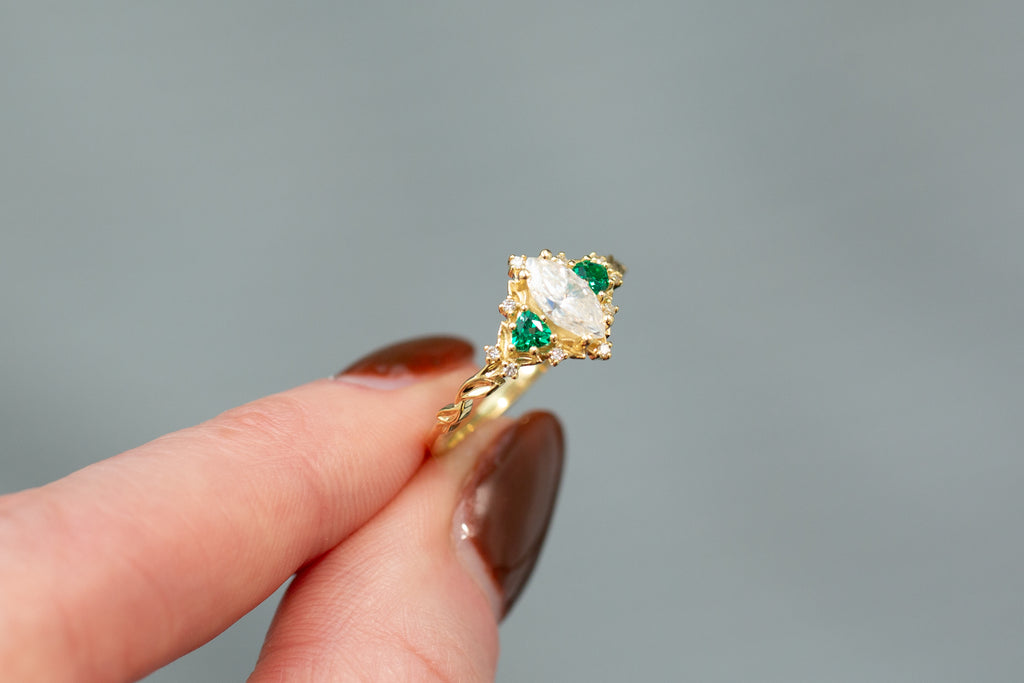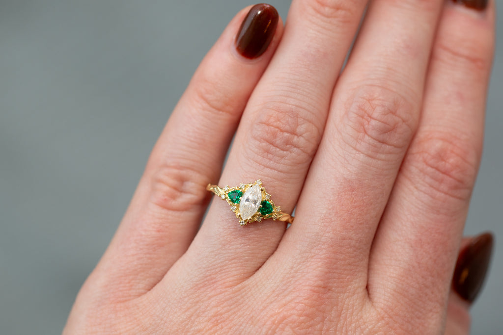 -Sides/Accents: 3mm trillion lab emerald, 1mm lab diamond