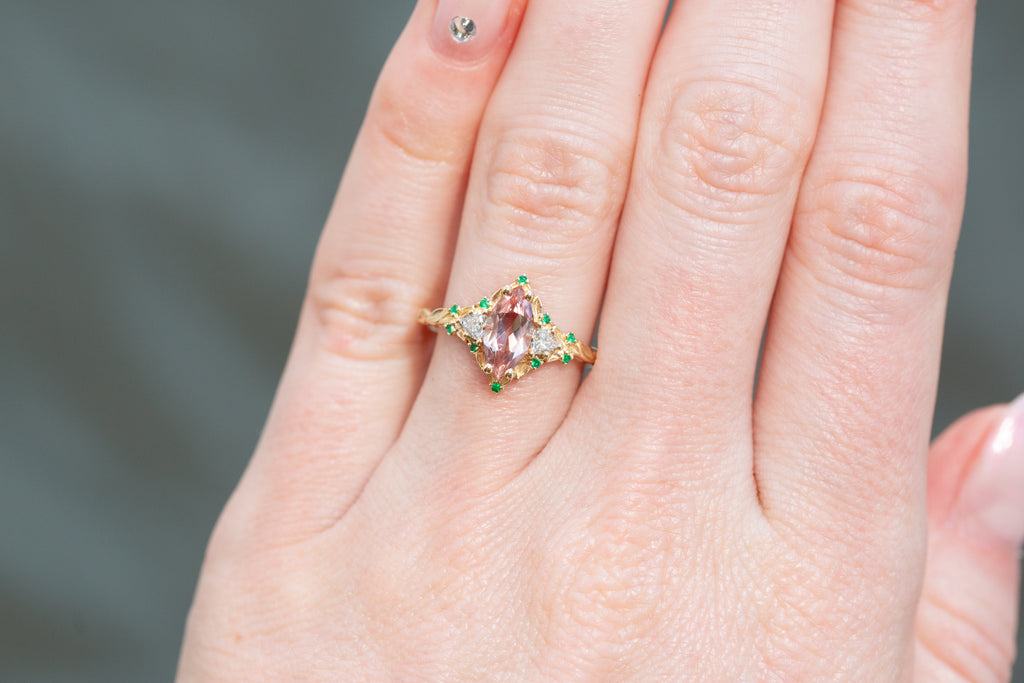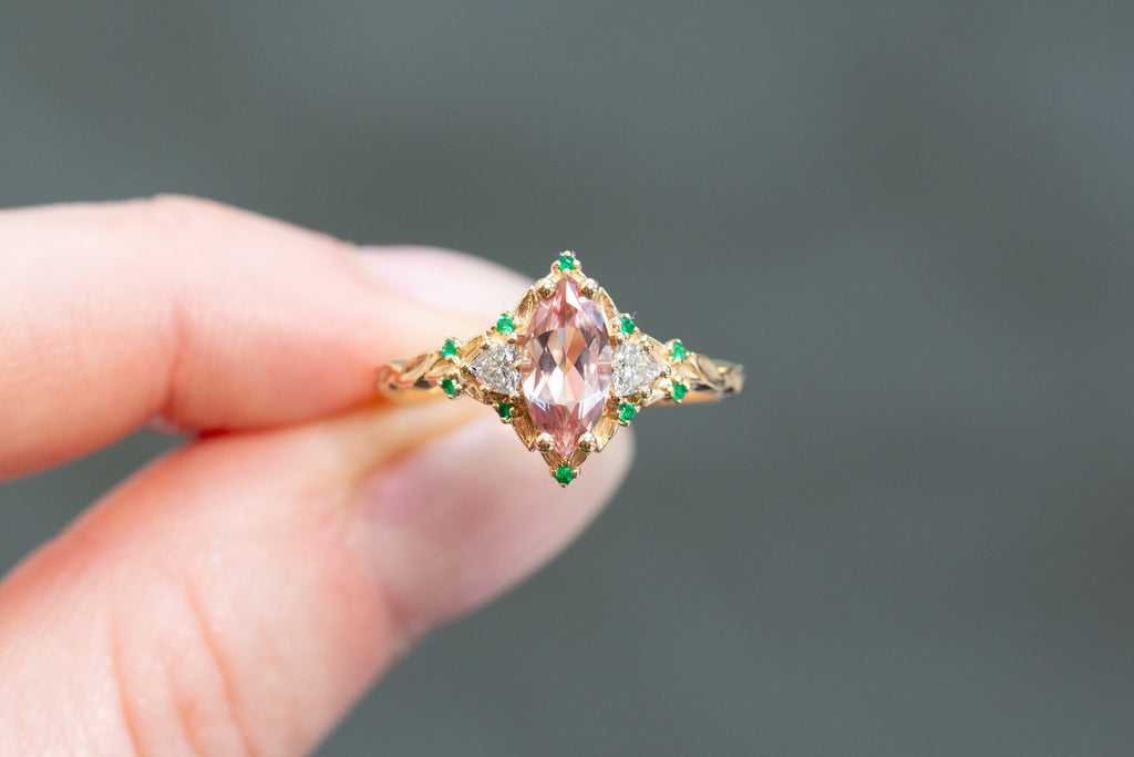 -Side/Accents Stones: 3mm trillion lab diamond, 1mm natural emerald