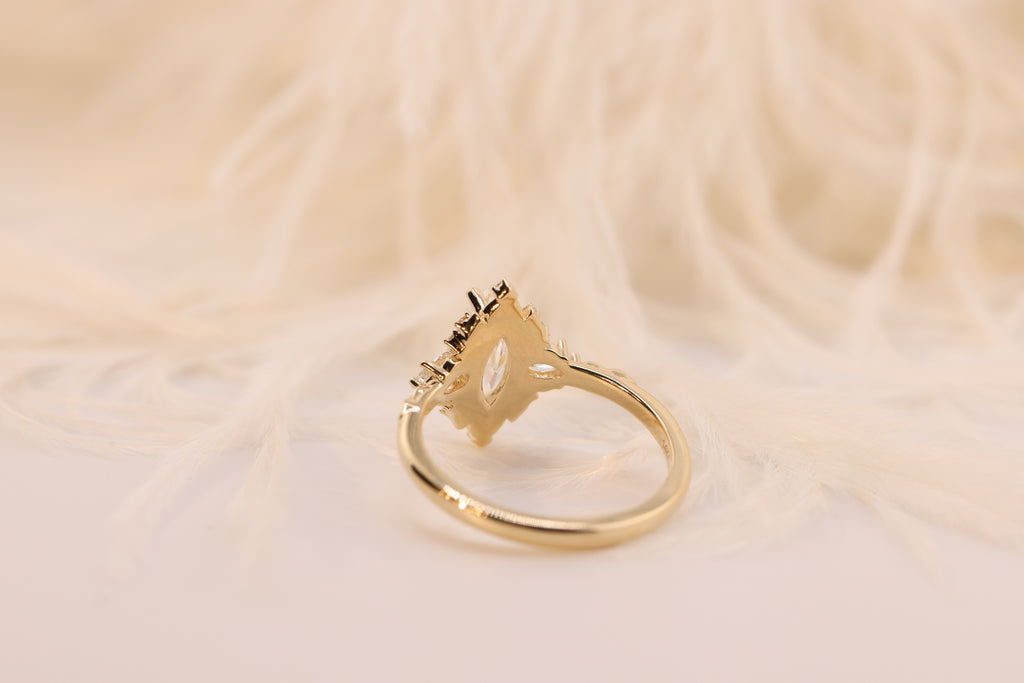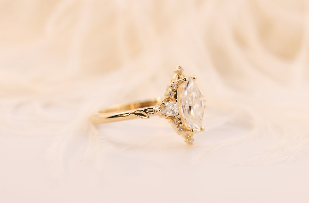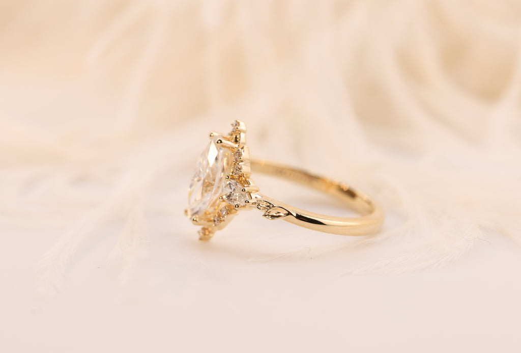 -Side/Accents: 4x2.5mm pear lab diamond, 1mm round lab diamond