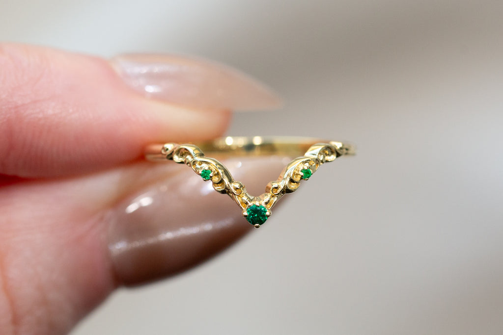 - Side/accent stones: 2mm round lab emerald, 1mm round natural emerald