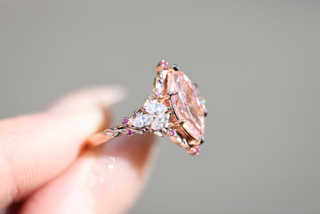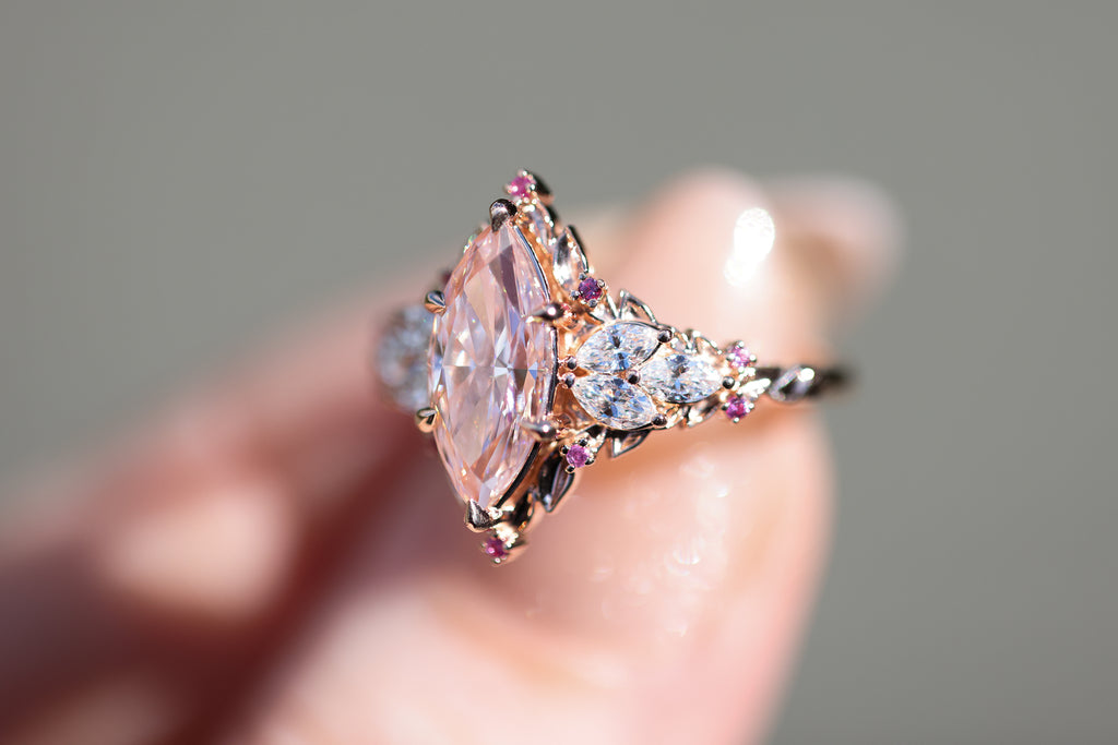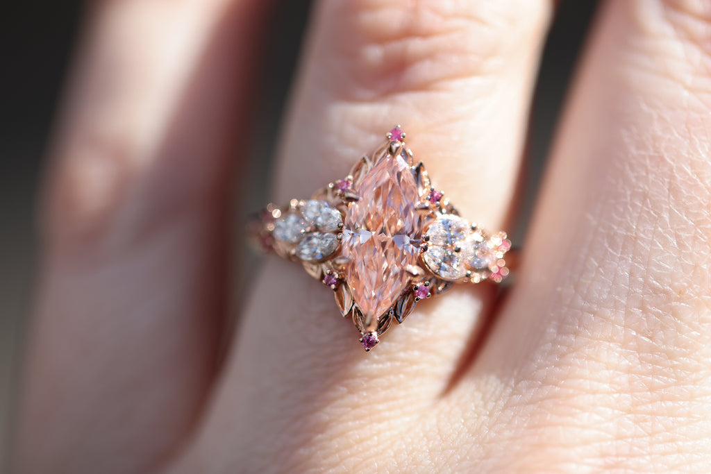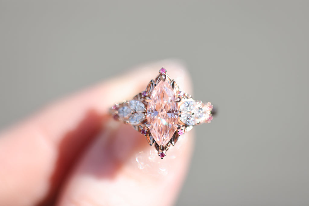- Side/accents stones: 4x2mm marquise lab diamond, 1mm AA pink sapphire